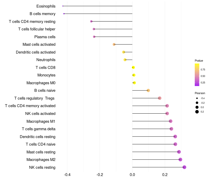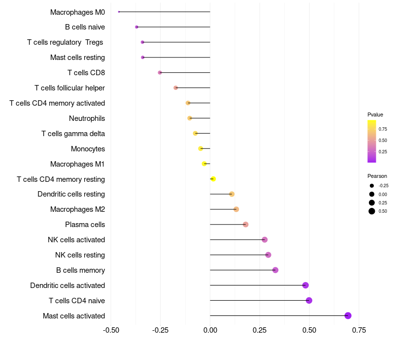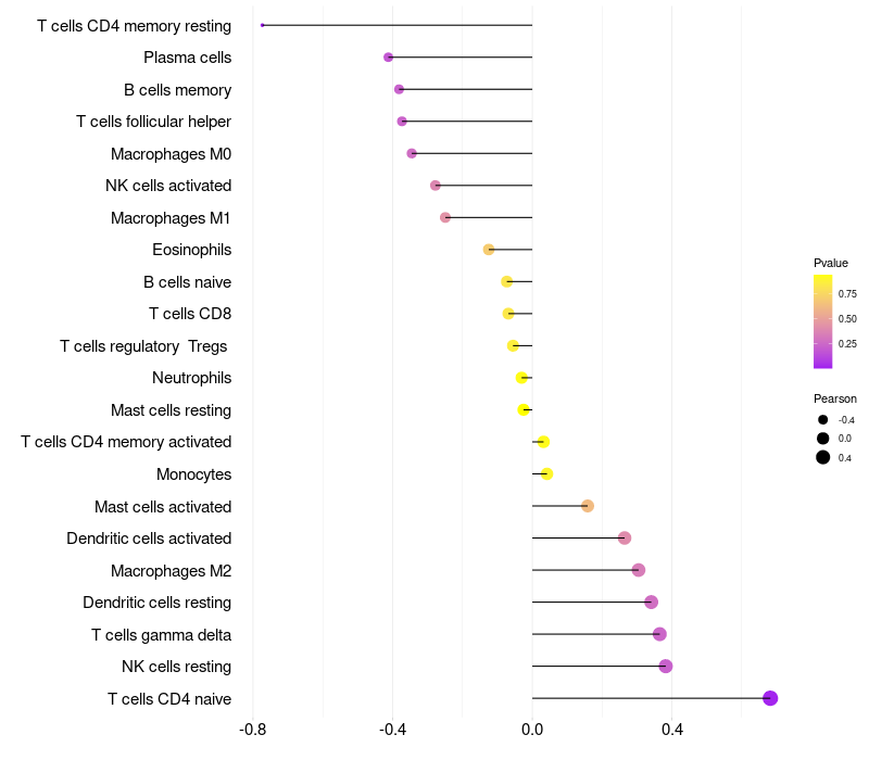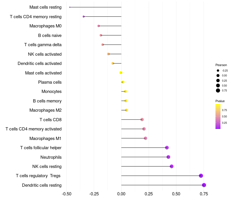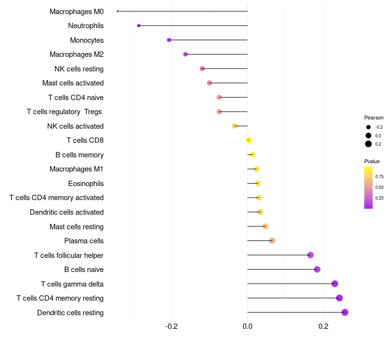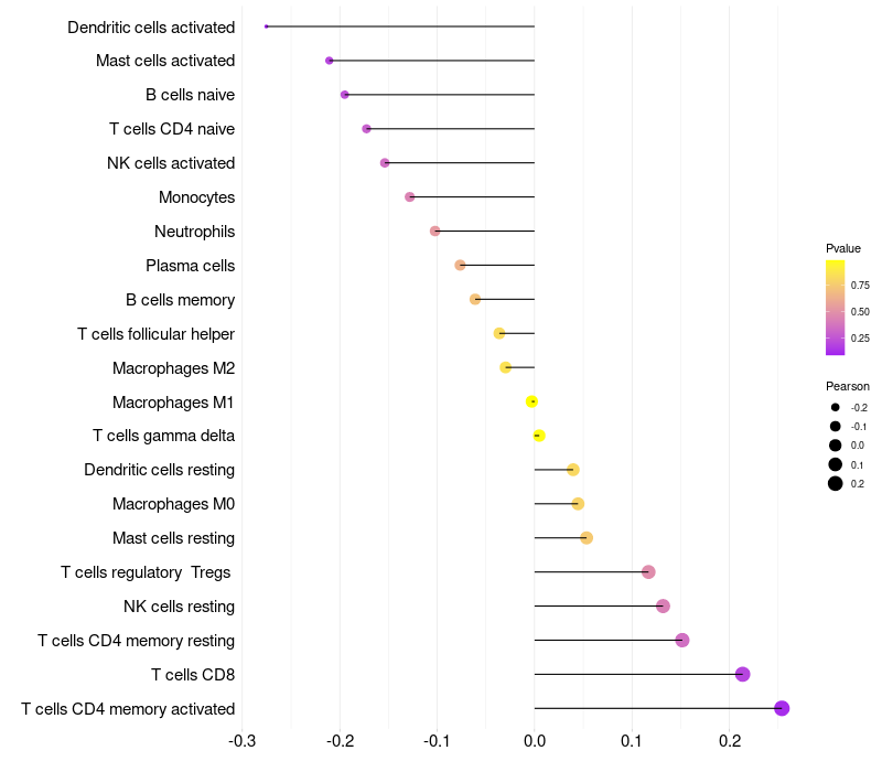 Lollipop of RASSF9 expression and immune infiltrating cell level correlation result in HPV+ samples