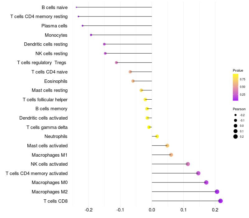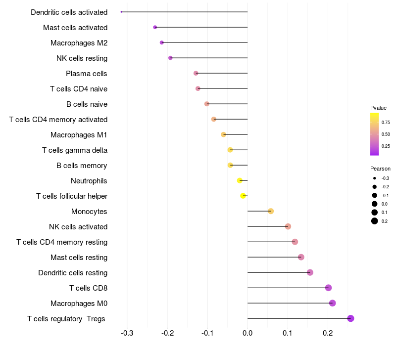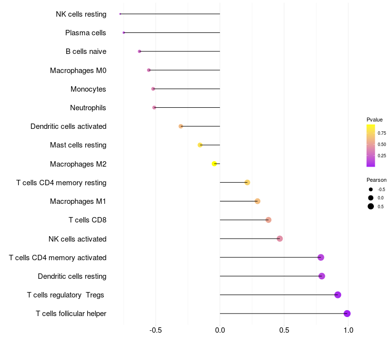 Lollipop of RDH16 expression and immune infiltrating cell level correlation result in HPV+ samples