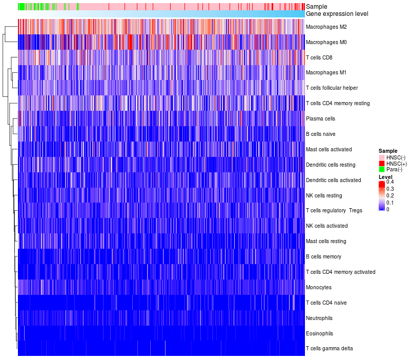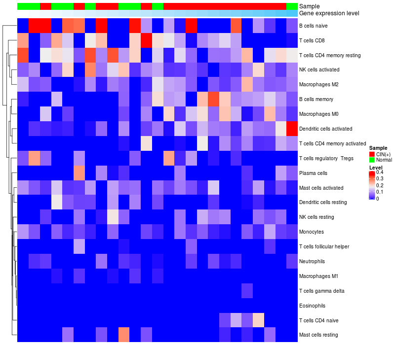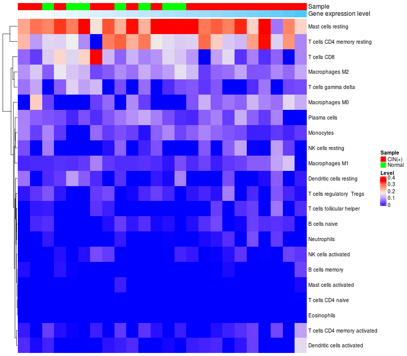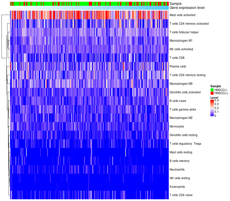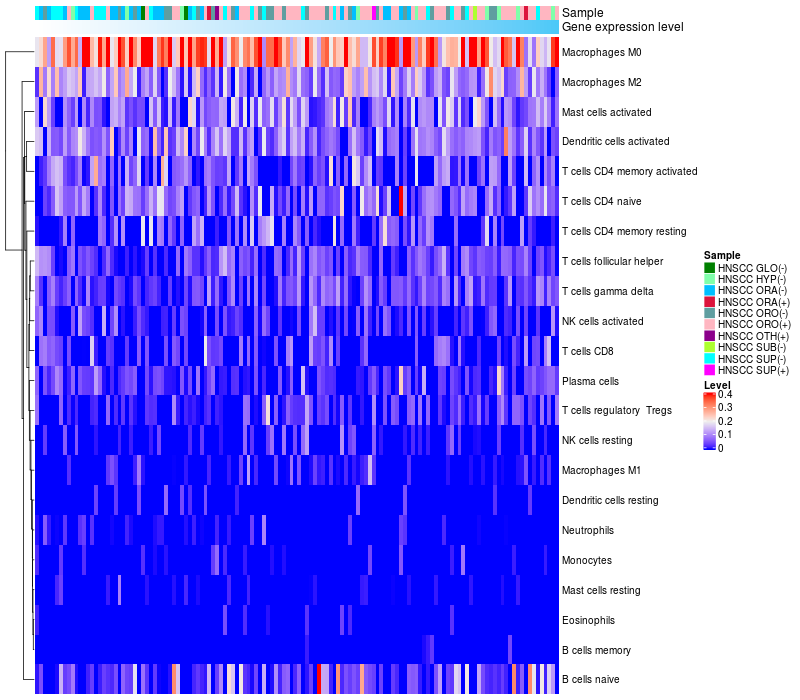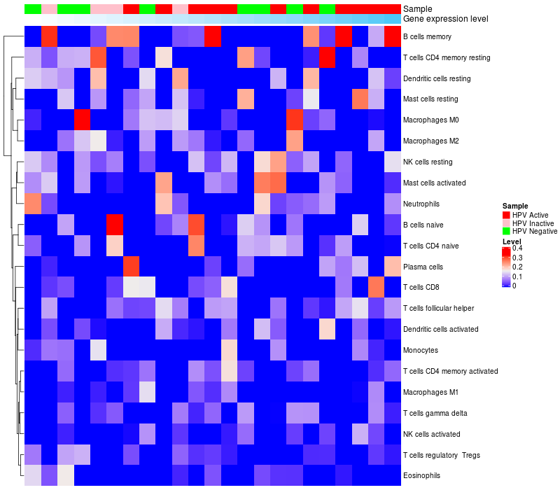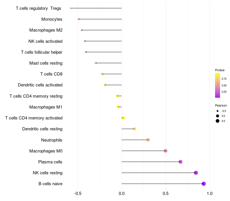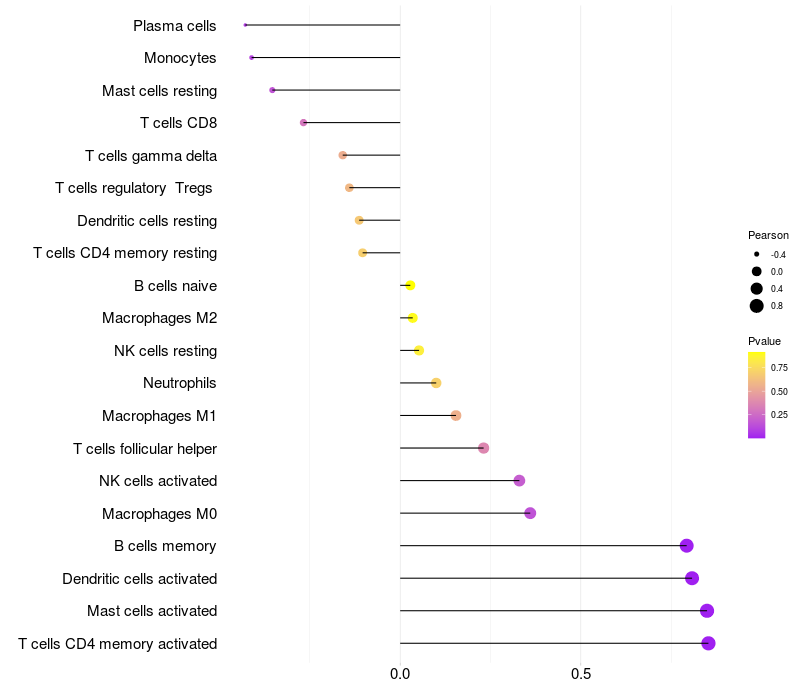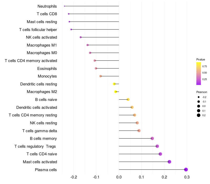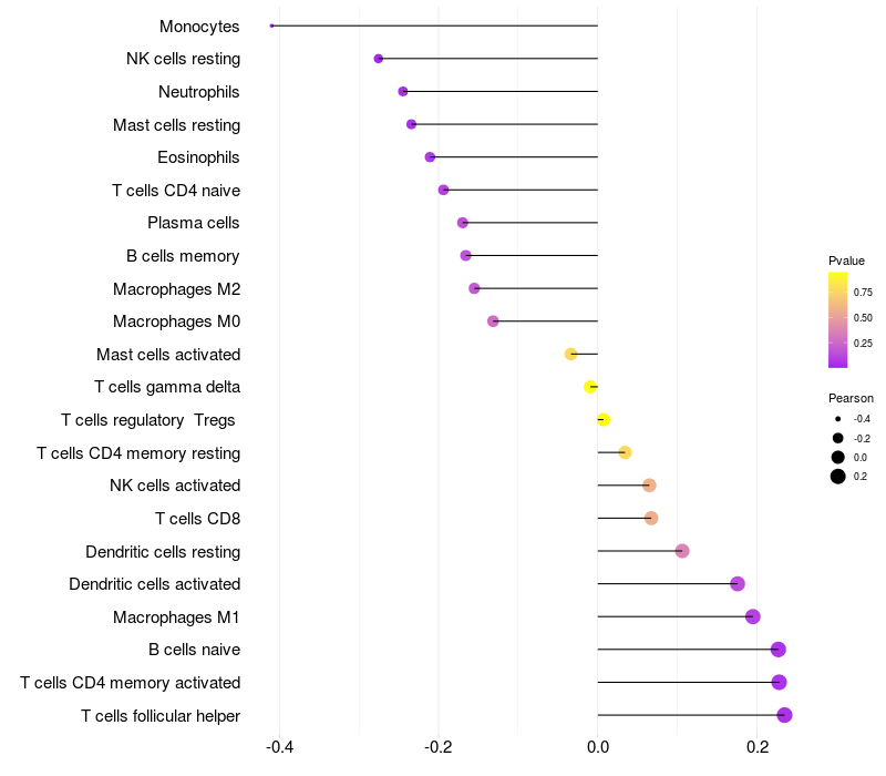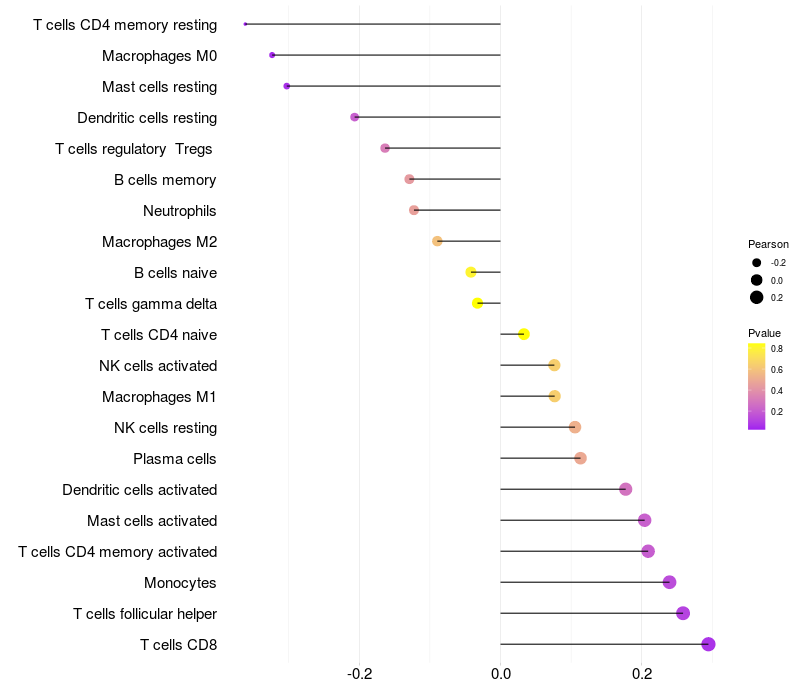 Lollipop of RFC4 expression and immune infiltrating cell level correlation result in HPV+ samples