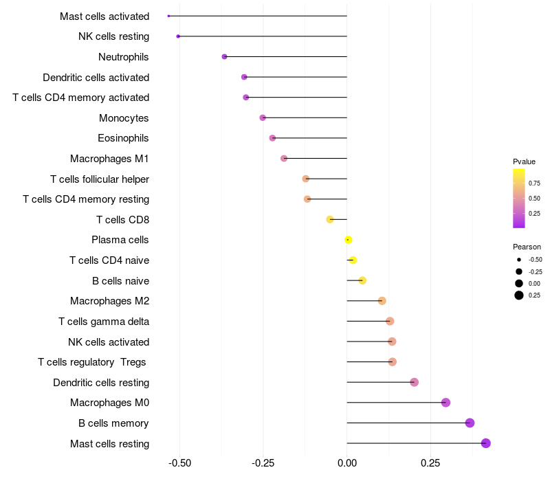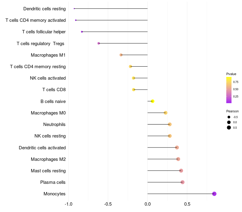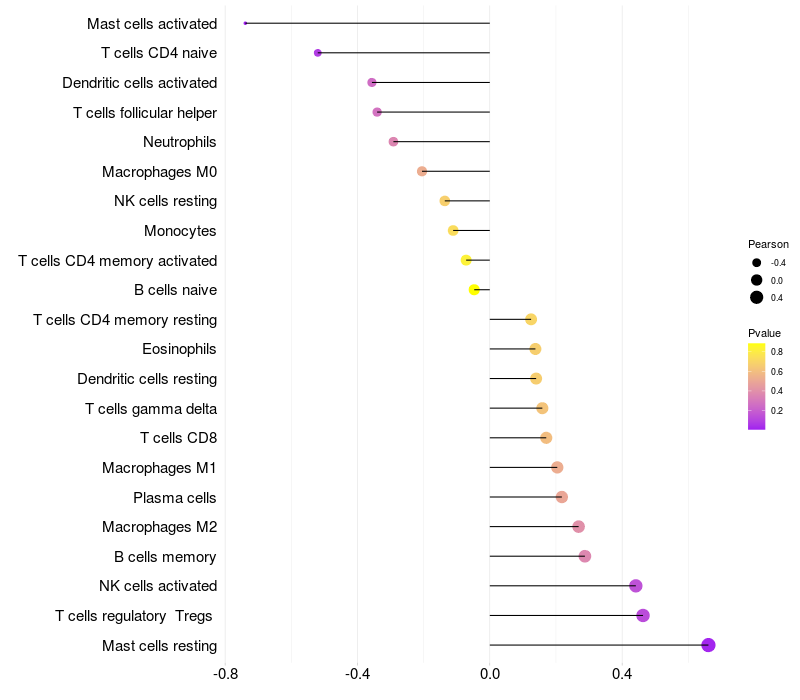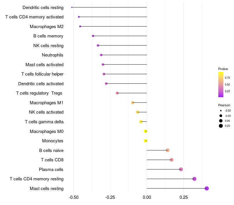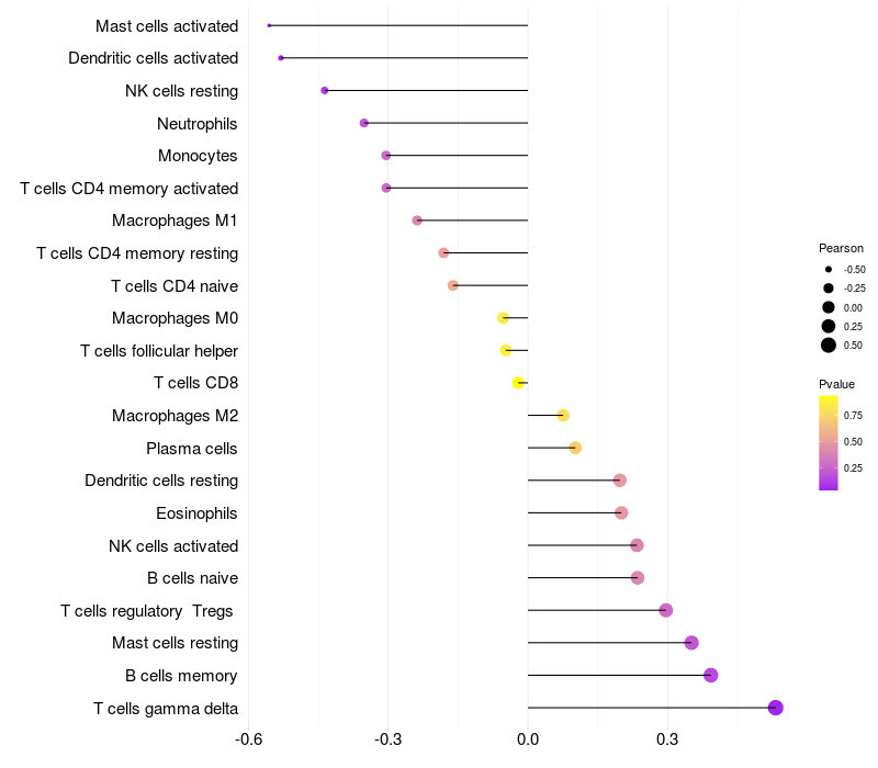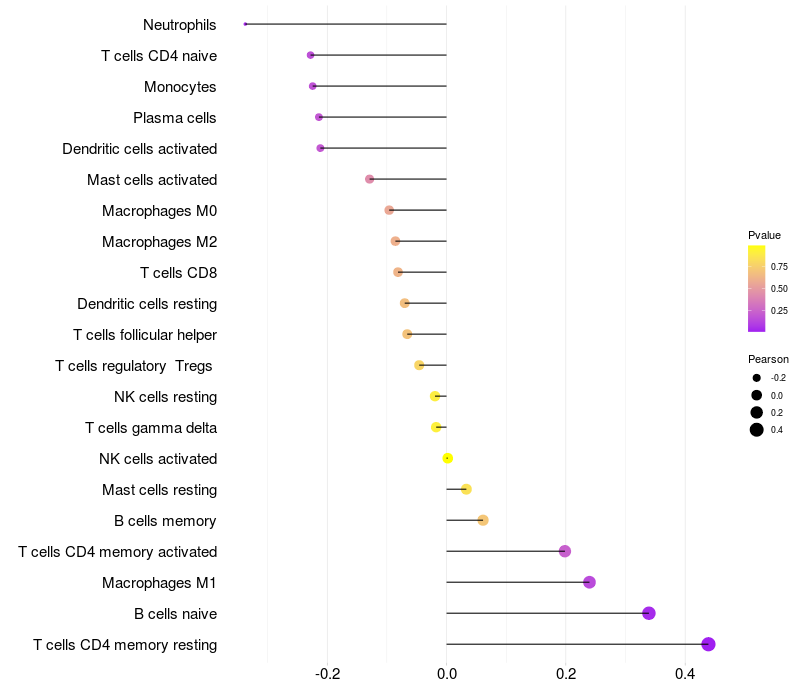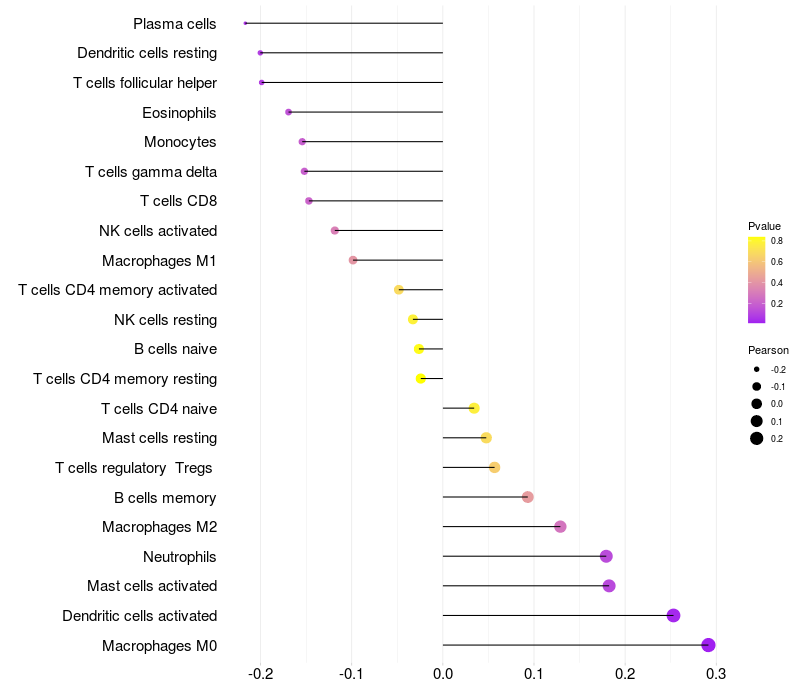 Lollipop of RGPD1 expression and immune infiltrating cell level correlation result in HPV+ samples