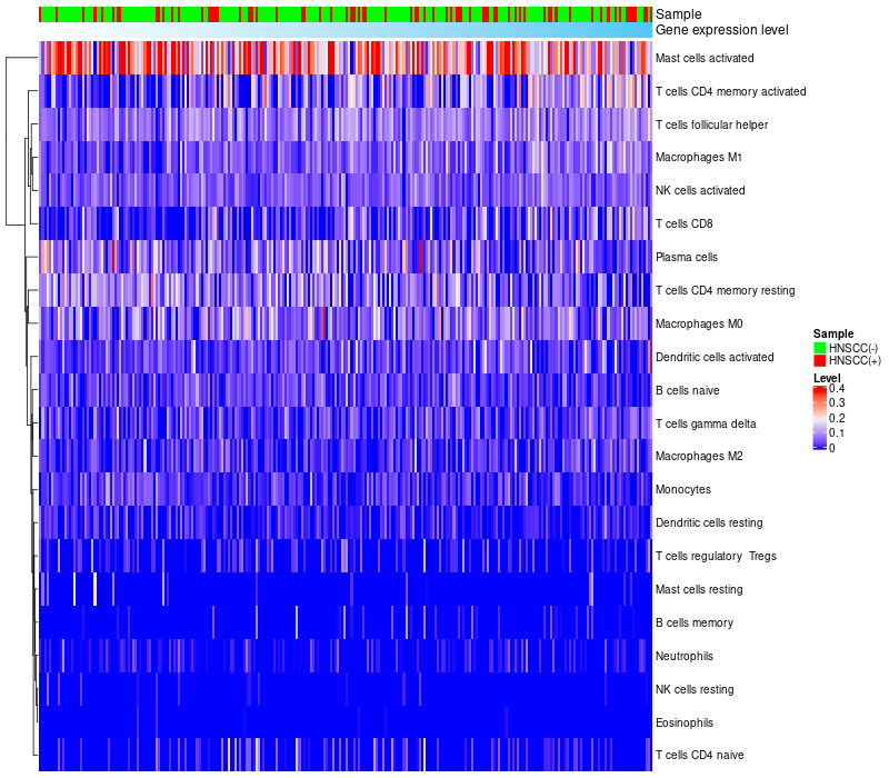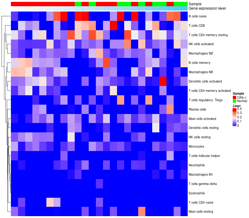 • Left: Heatmap of target gene expression and the level of various types of immune cells (cell type fractions) in all samples based on CIBERSORT method.