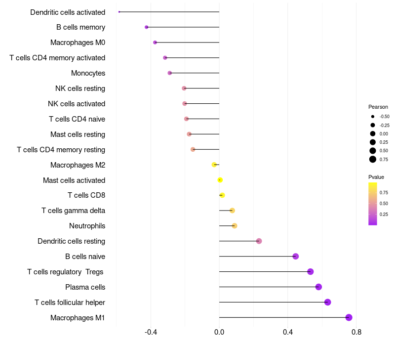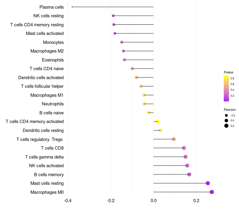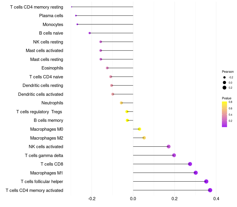 HeatMap of cell type fractions in all samples Lollipop of RHEBL1 expression and immune infiltrating cell level correlation result in HPV+ samples