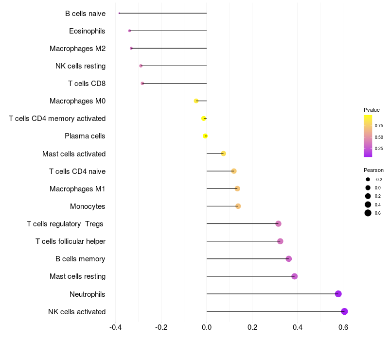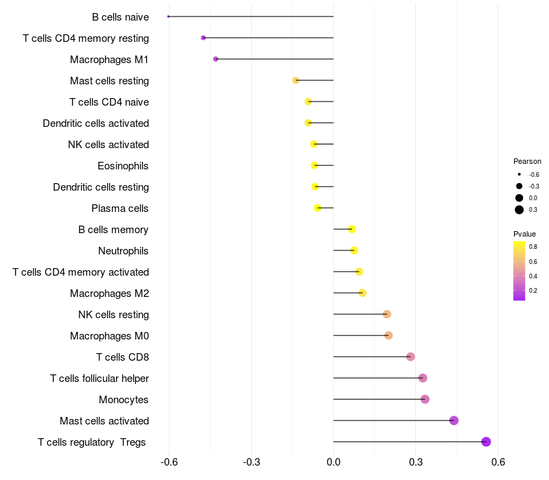 Lollipop of RICTOR expression and immune infiltrating cell level correlation result in HBV+ Liver cirrhosis samples