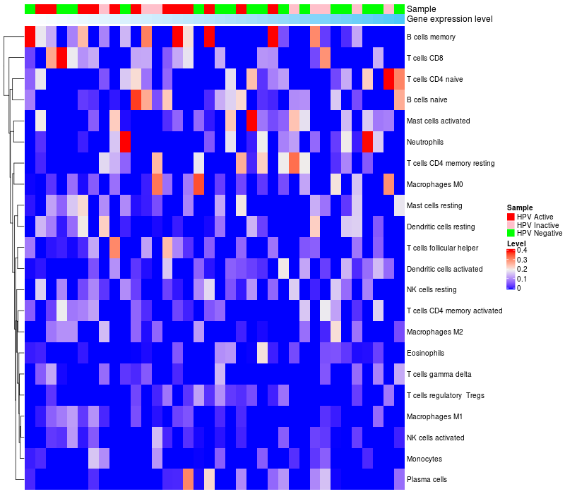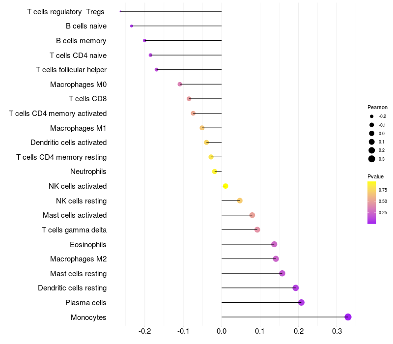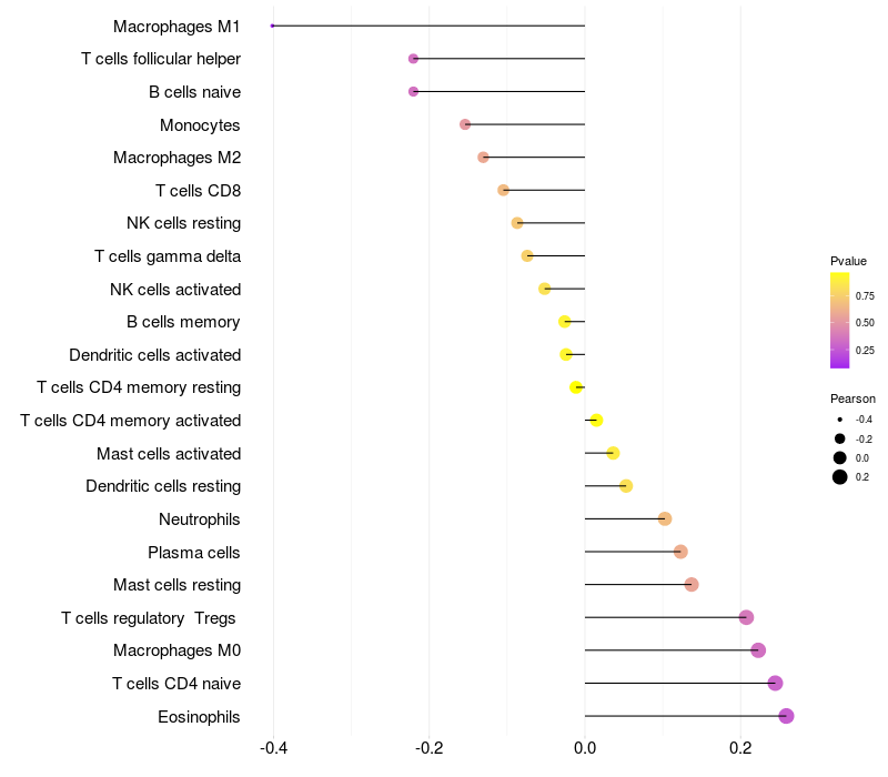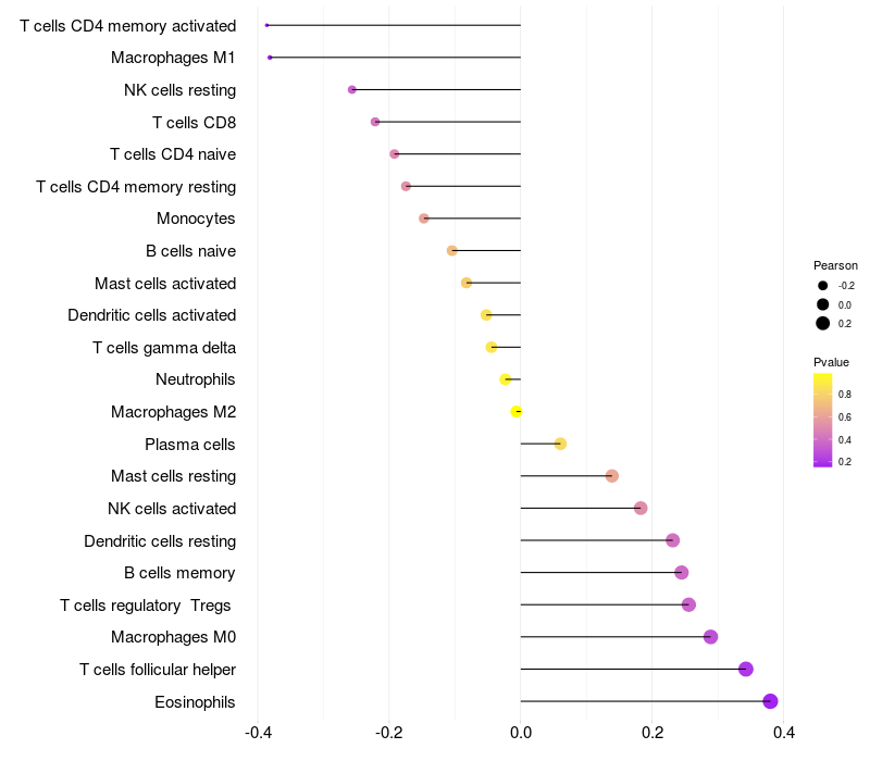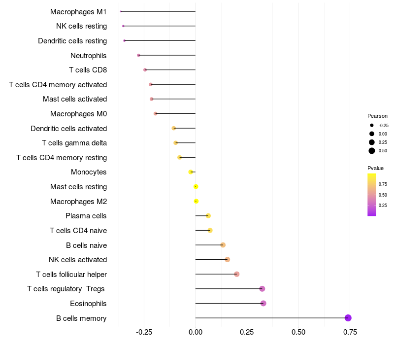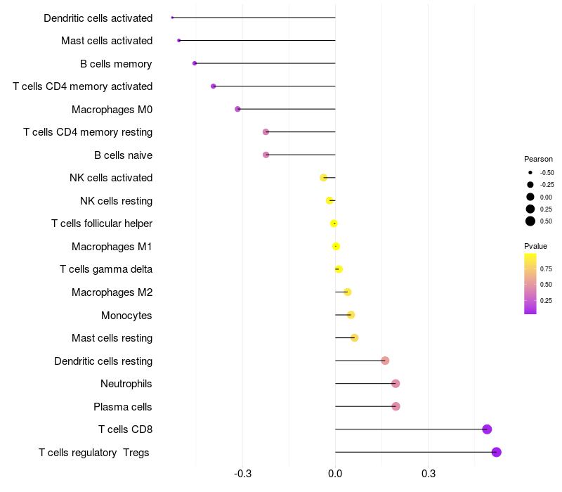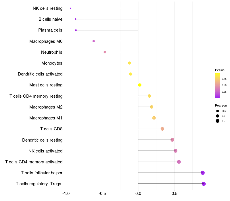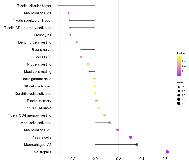 Lollipop of RNASE10 expression and immune infiltrating cell level correlation result in HPV+ samples