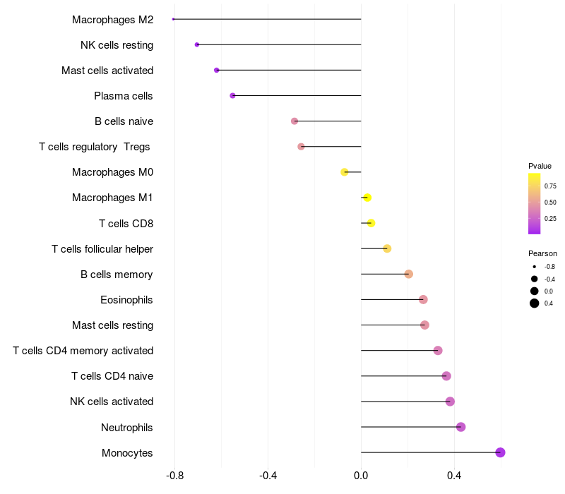 Lollipop of RNF10 expression and immune infiltrating cell level correlation result in HBV+ samples