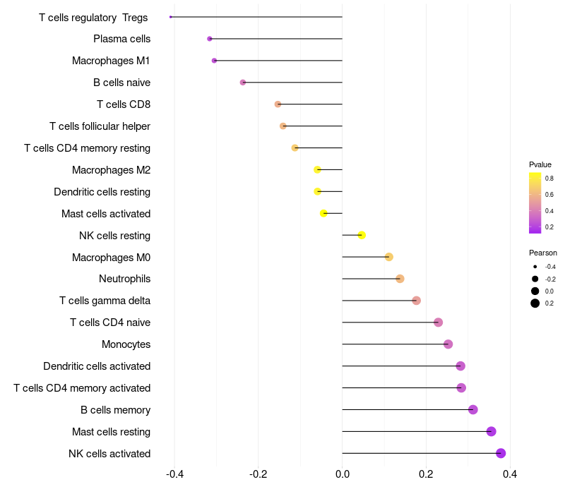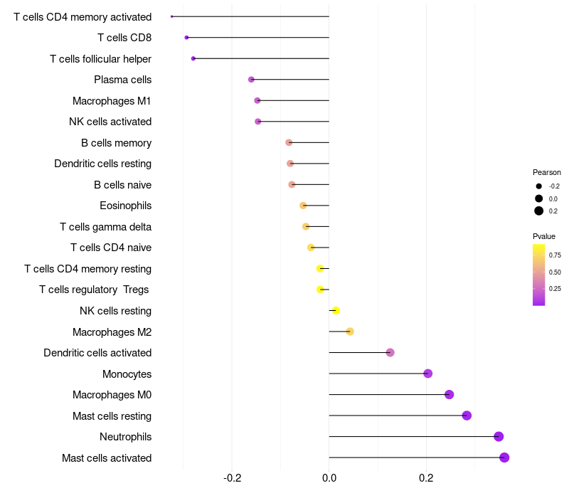 Lollipop of RPL29 expression and immune infiltrating cell level correlation result in HPV+ samples