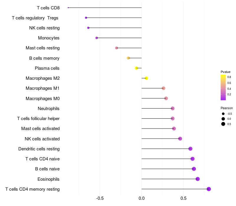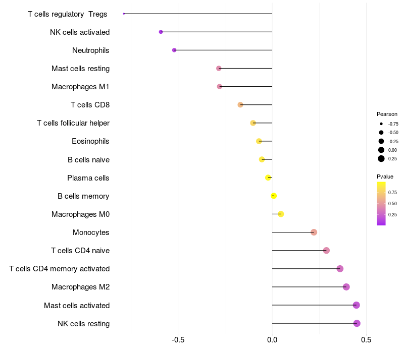 Lollipop of RPL37A expression and immune infiltrating cell level correlation result in HBV+ samples