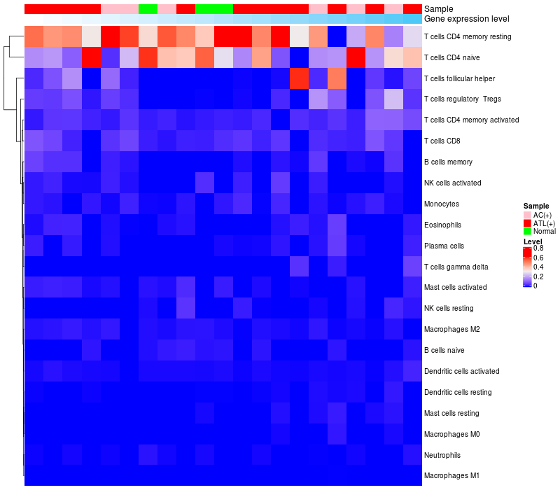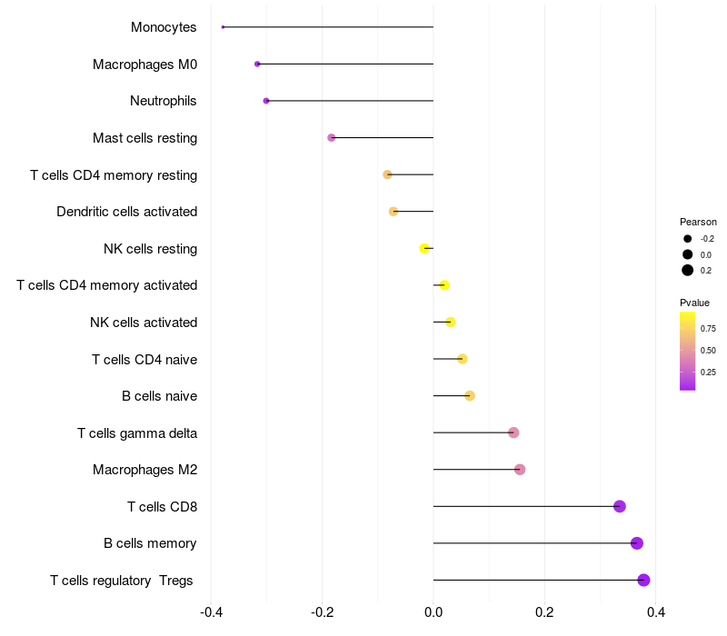 Lollipop of SAMD13 expression and immune infiltrating cell level correlation result in HTLV1+ samples