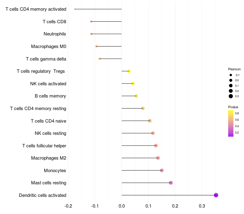 Lollipop of SEMA6C expression and immune infiltrating cell level correlation result in HTLV1+ samples