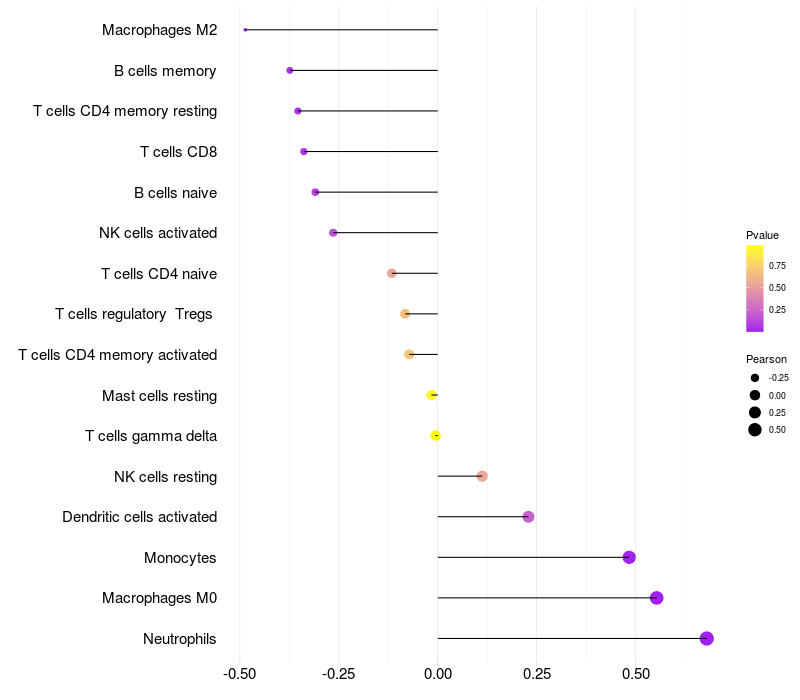 Lollipop of SLA expression and immune infiltrating cell level correlation result in HTLV1+ samples