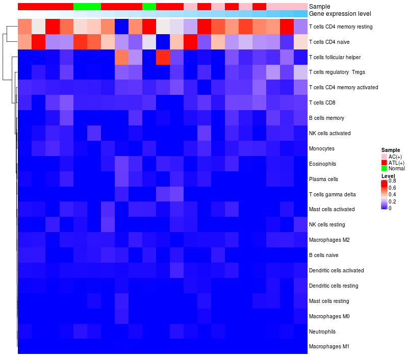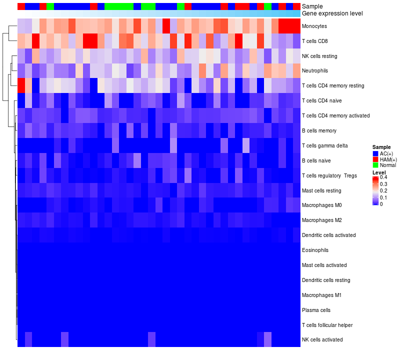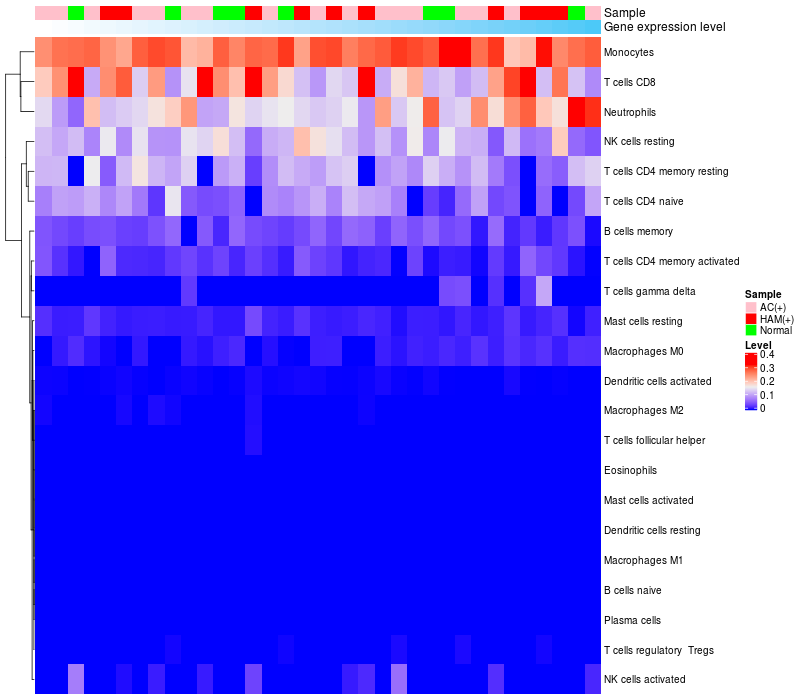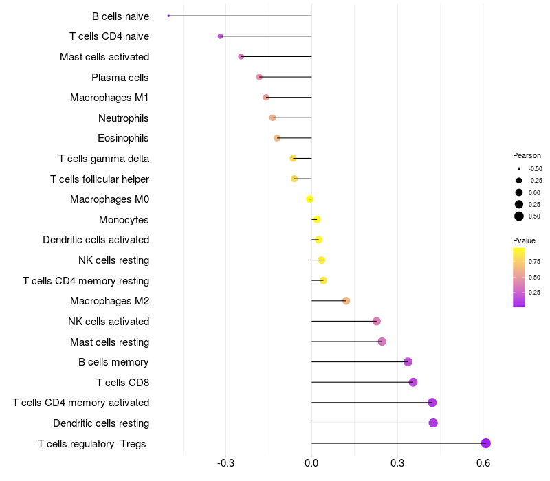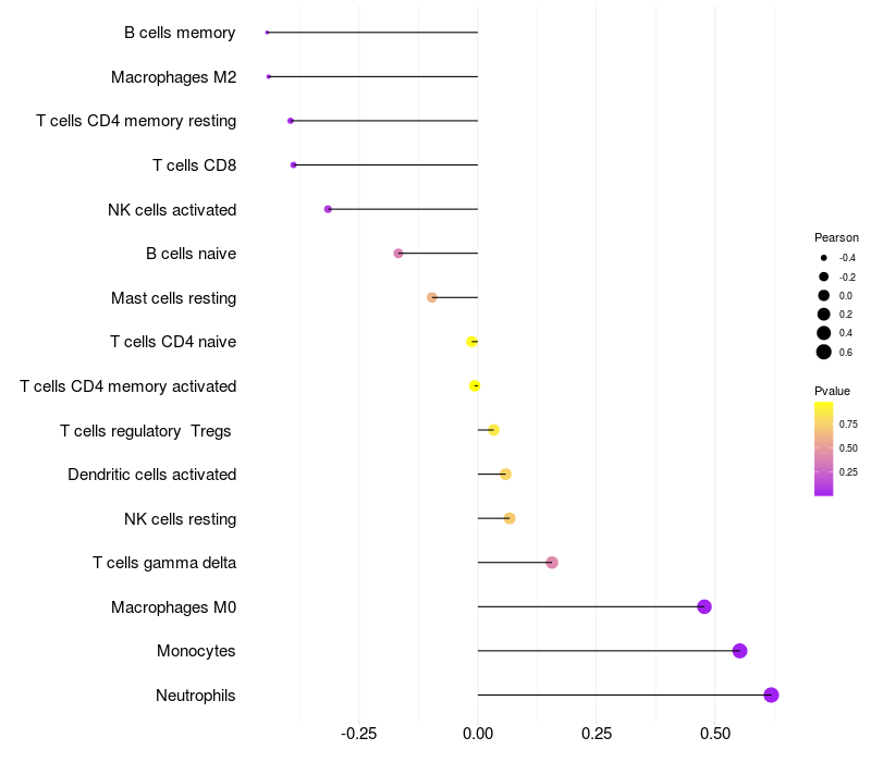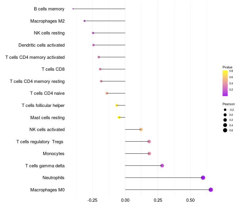 Lollipop of SLC15A4 expression and immune infiltrating cell level correlation result in HTLV1+ samples