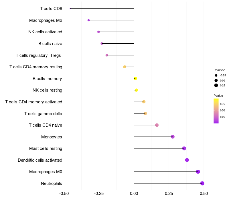 Lollipop of SLC25A37 expression and immune infiltrating cell level correlation result in HTLV1+ samples