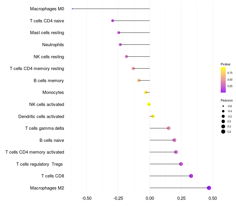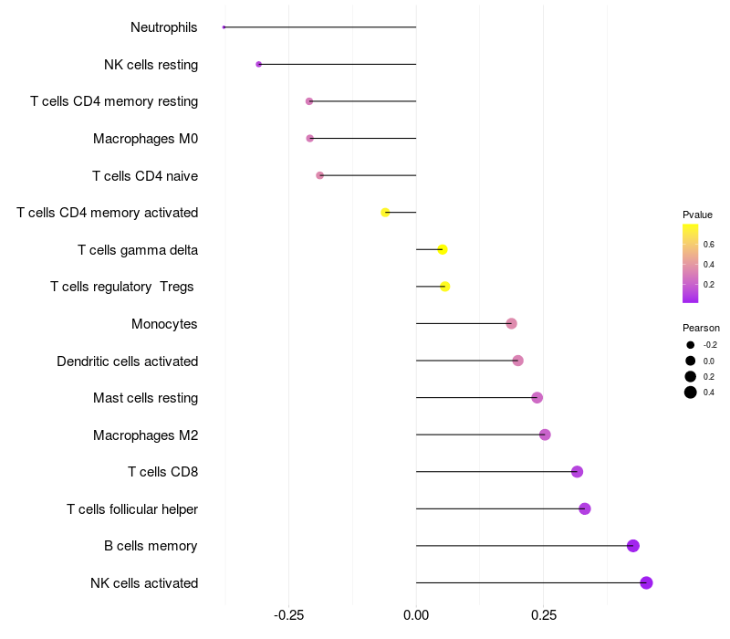 Lollipop of SLC25A43 expression and immune infiltrating cell level correlation result in HTLV1+ samples