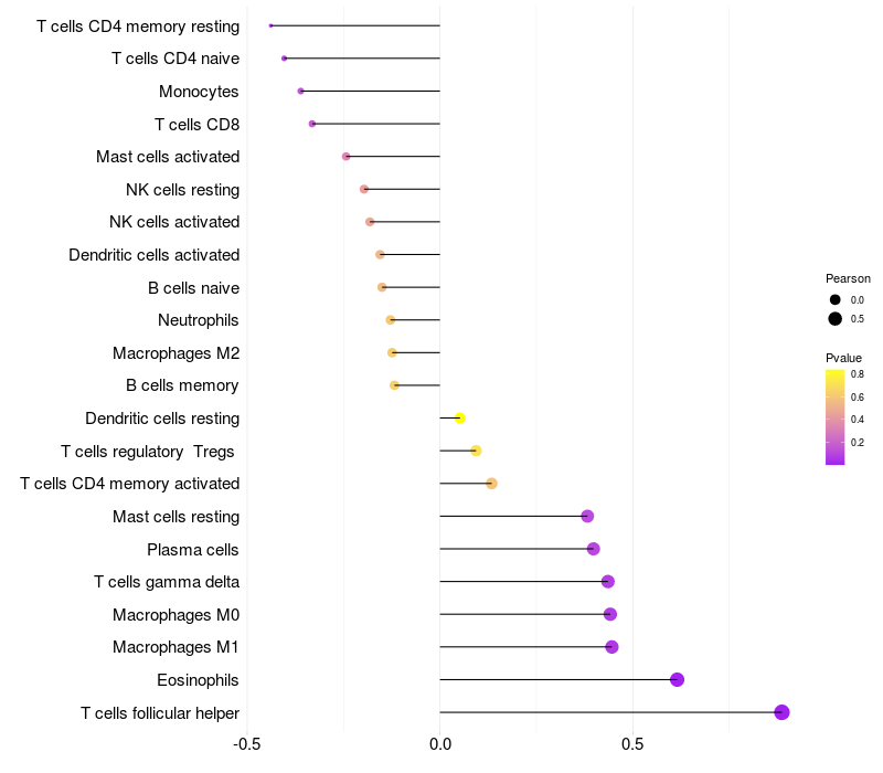 Lollipop of SLC28A3 expression and immune infiltrating cell level correlation result in HTLV1+ samples