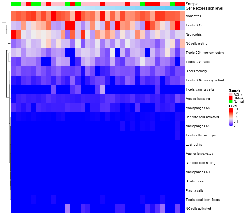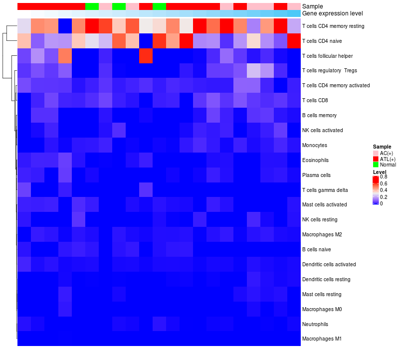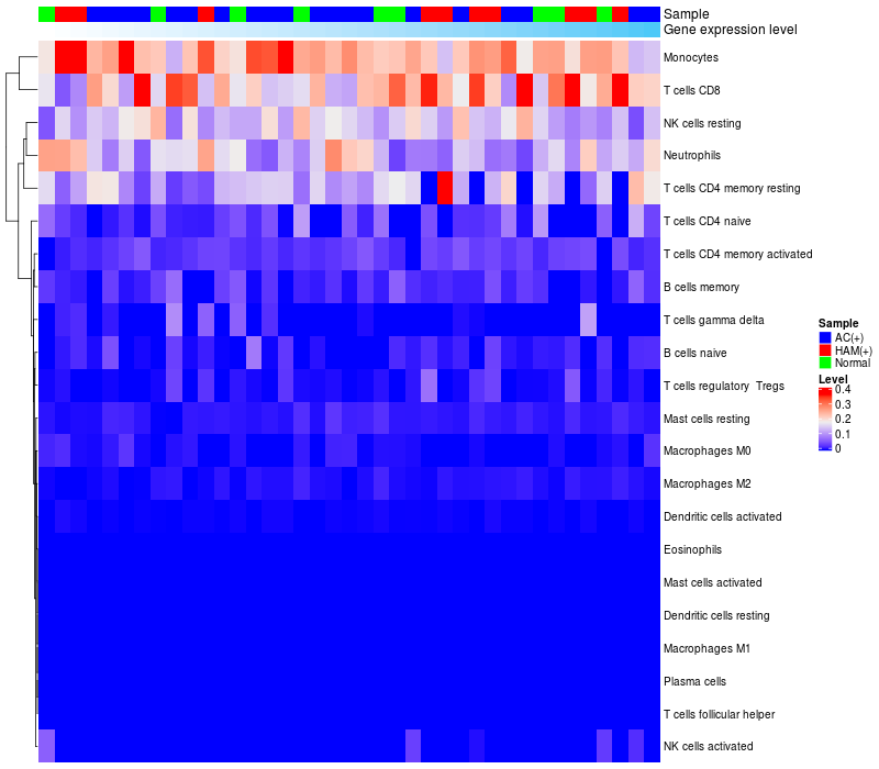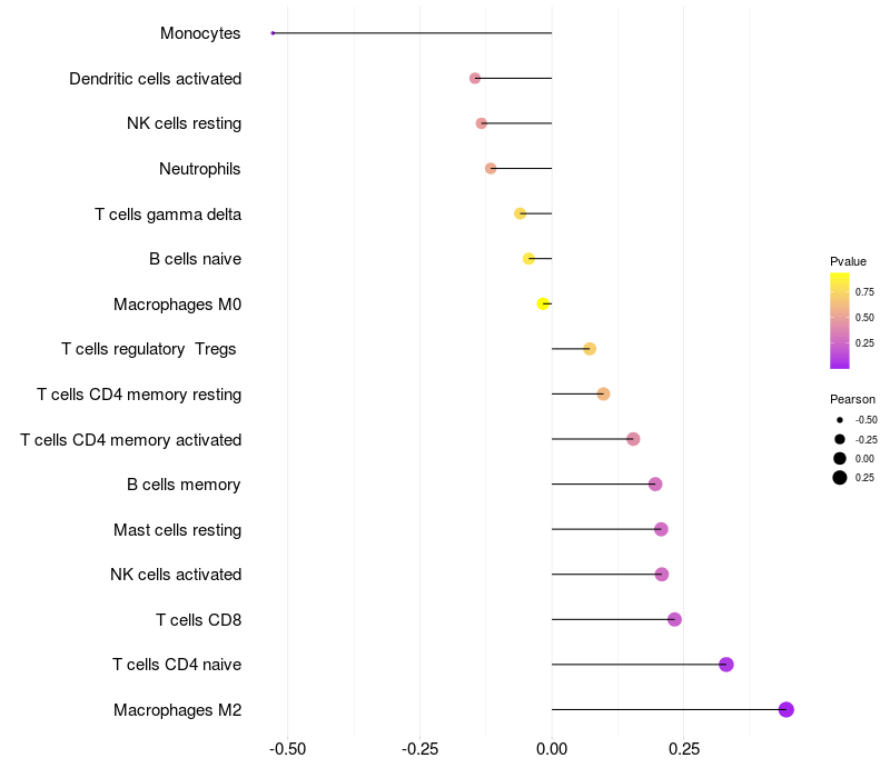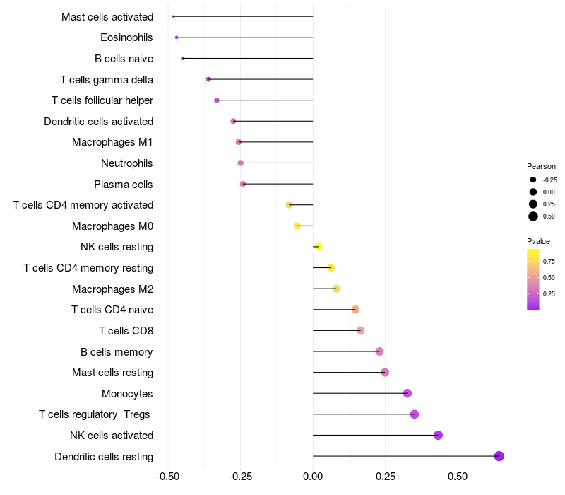 Lollipop of SLC35B4 expression and immune infiltrating cell level correlation result in HTLV1+ samples