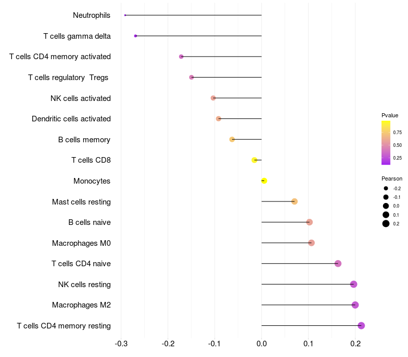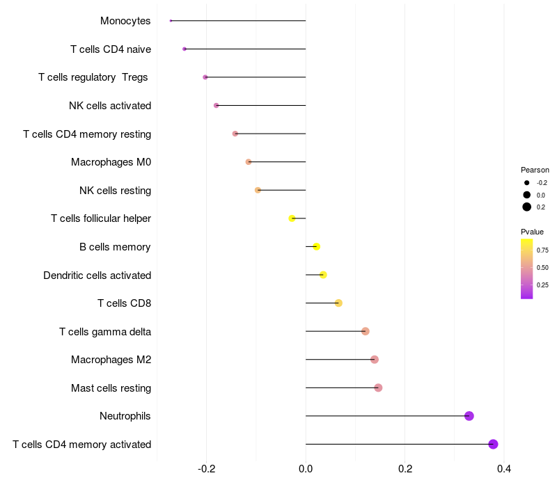 Lollipop of SLC6A5 expression and immune infiltrating cell level correlation result in HTLV1+ samples