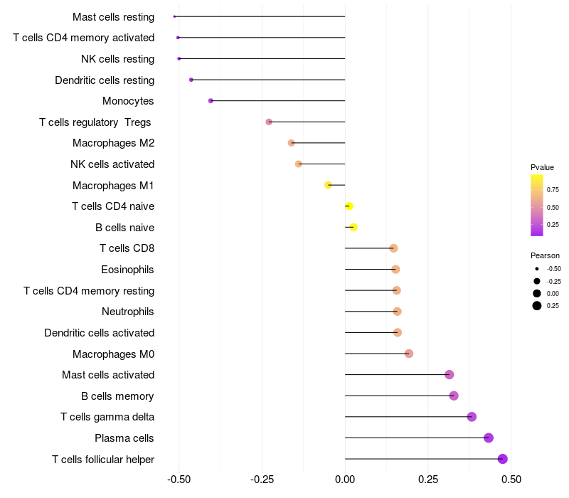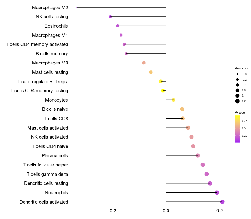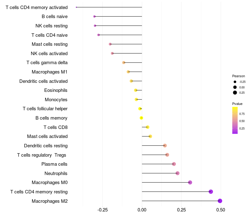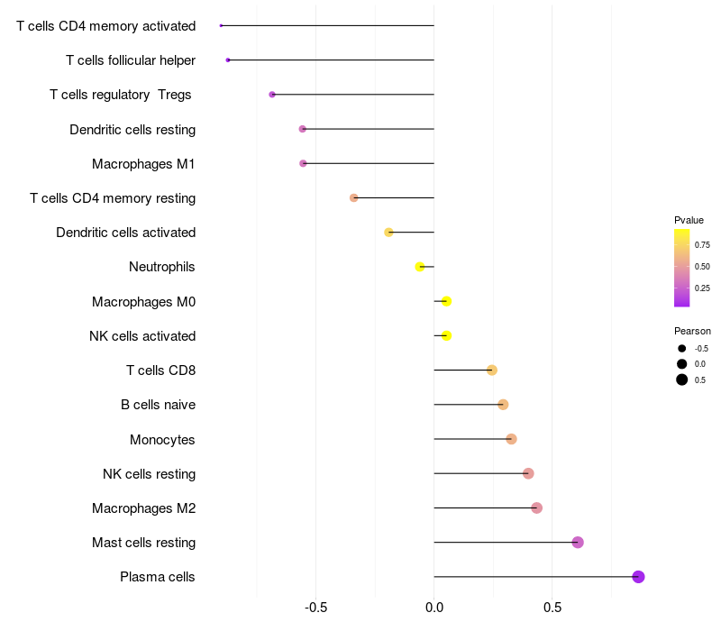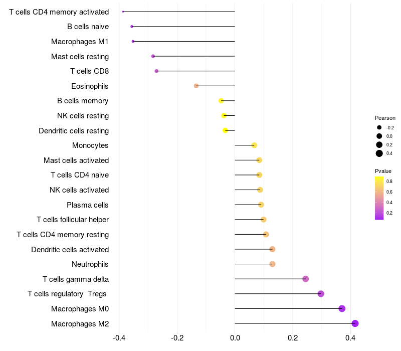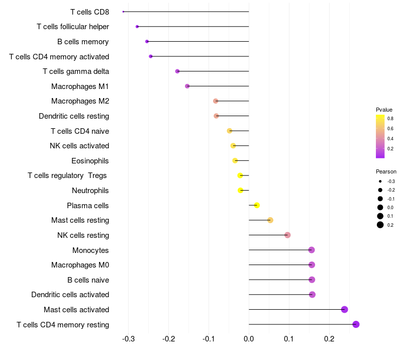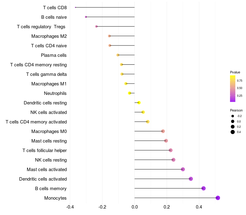 Lollipop of SMARCA1 expression and immune infiltrating cell level correlation result in HPV+ samples