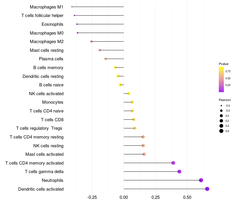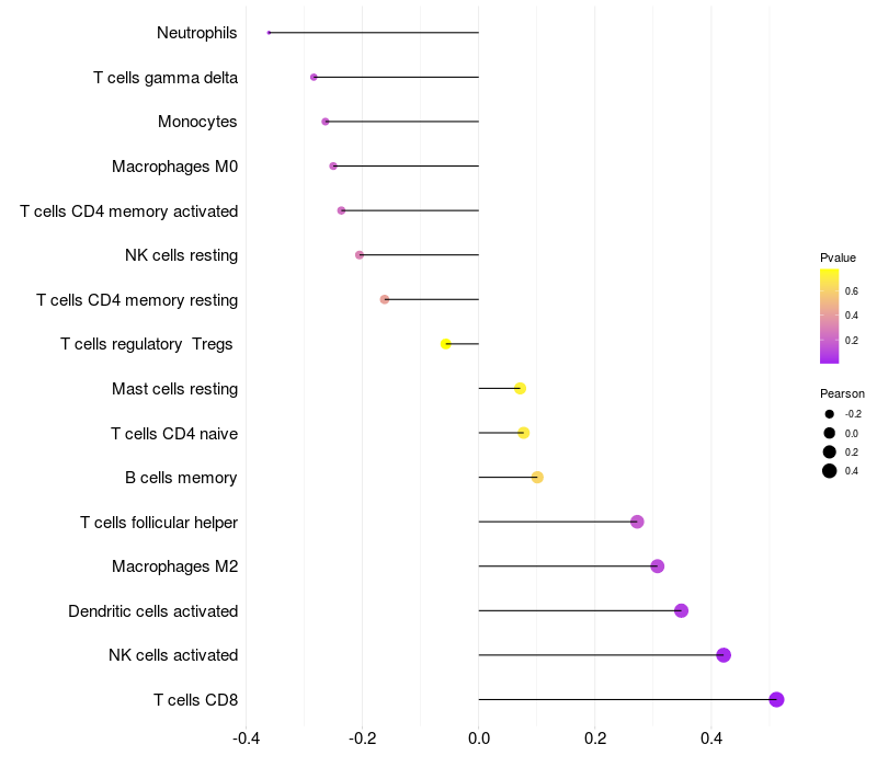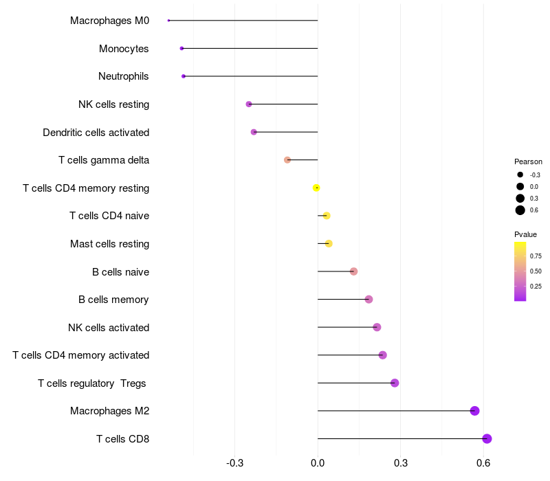 Lollipop of SMYD2 expression and immune infiltrating cell level correlation result in HTLV1+ samples