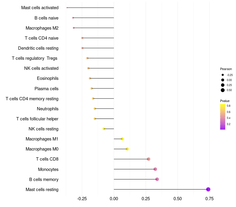 Lollipop of SNX15 expression and immune infiltrating cell level correlation result in HBV+ Liver cirrhosis samples