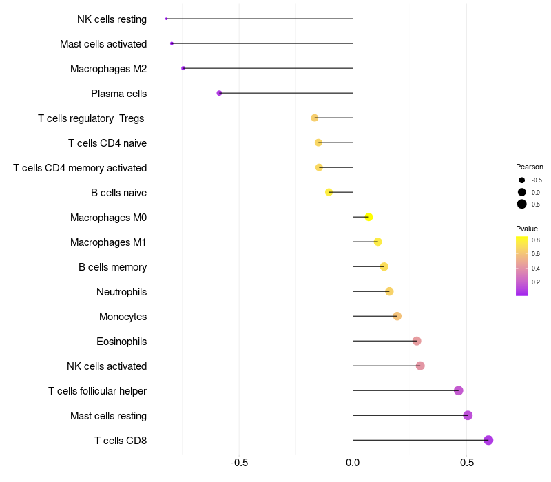 Lollipop of SNX15 expression and immune infiltrating cell level correlation result in HBV+ Hepatocellular carcinoma samples