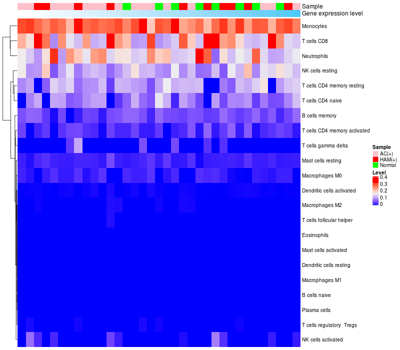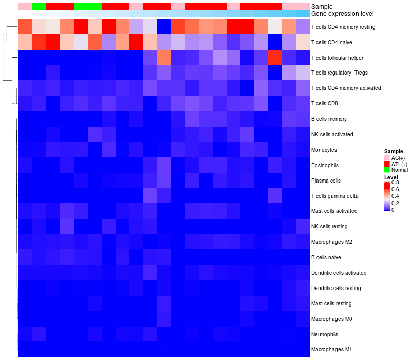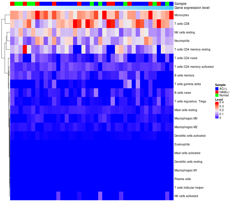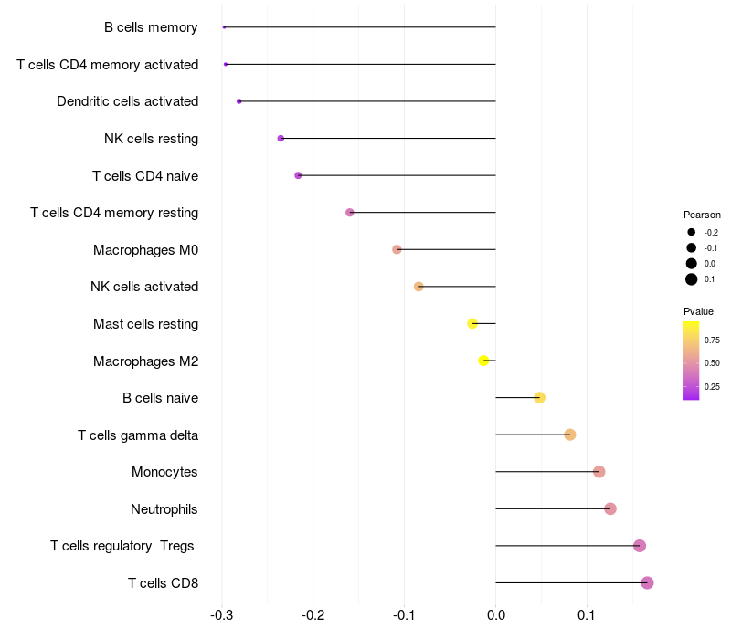 Lollipop of ST8SIA6 expression and immune infiltrating cell level correlation result in HTLV1+ samples