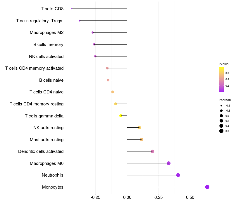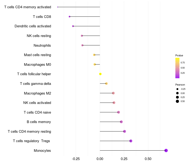 Lollipop of STAB1 expression and immune infiltrating cell level correlation result in HTLV1+ samples