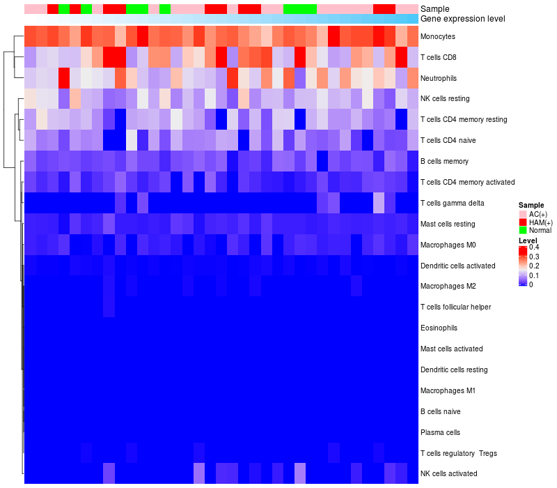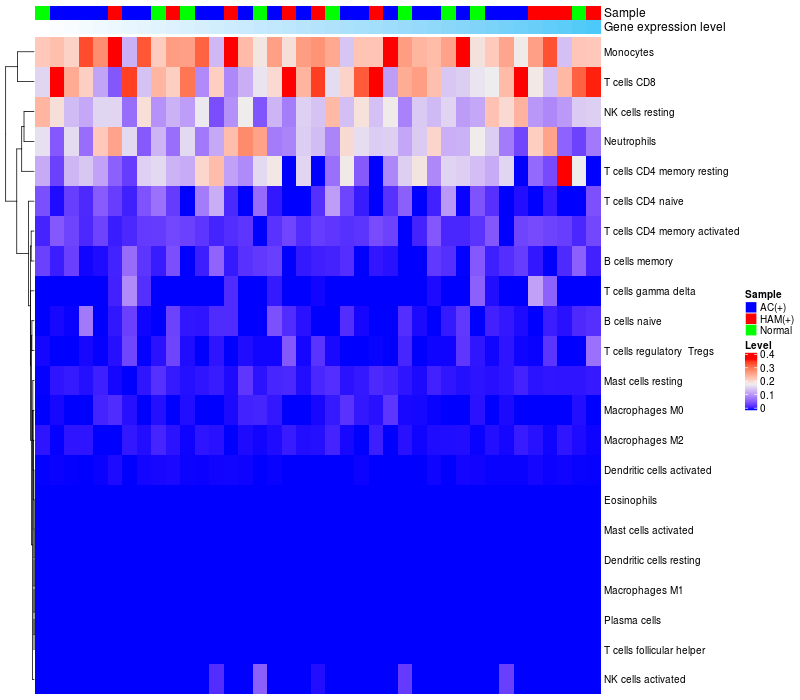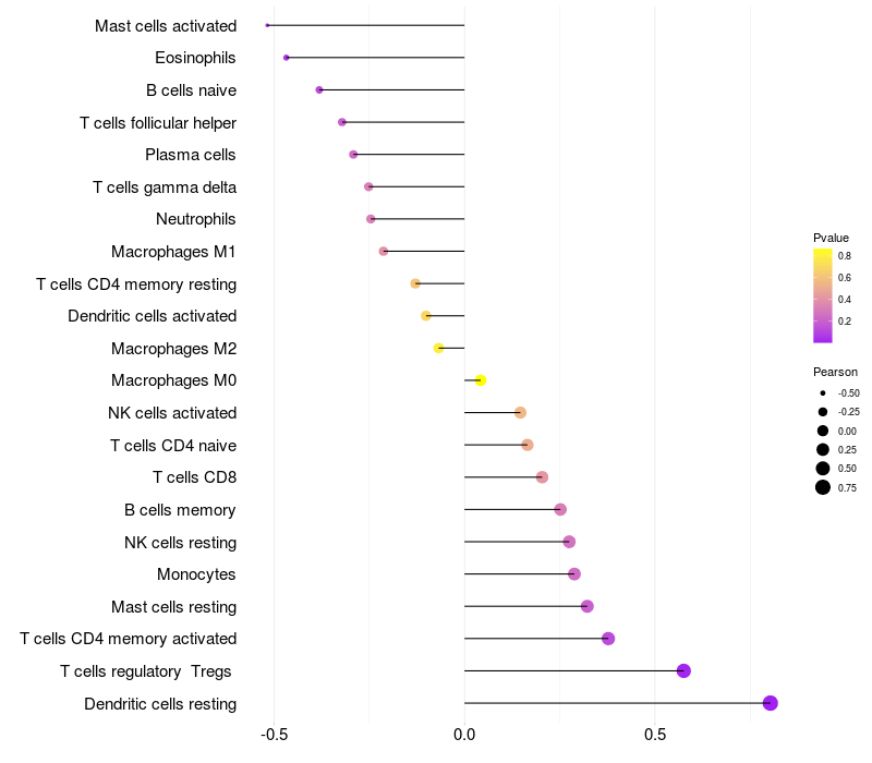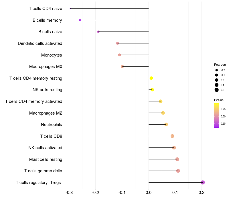 Lollipop of SYPL2 expression and immune infiltrating cell level correlation result in HTLV1+ samples