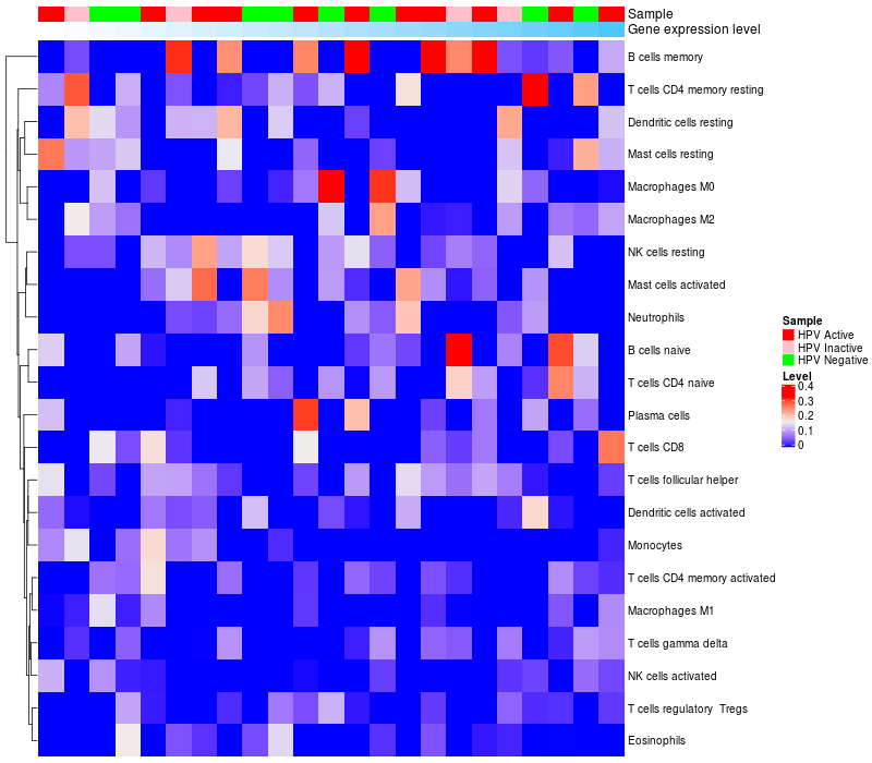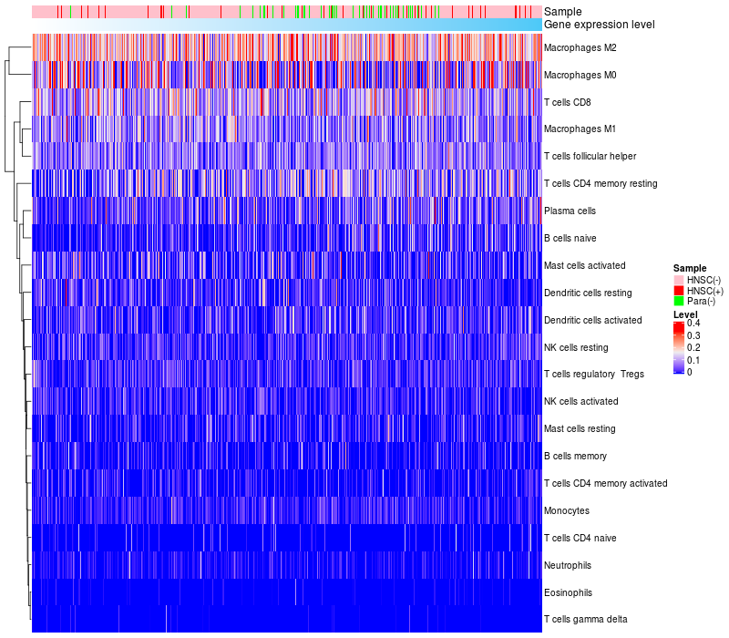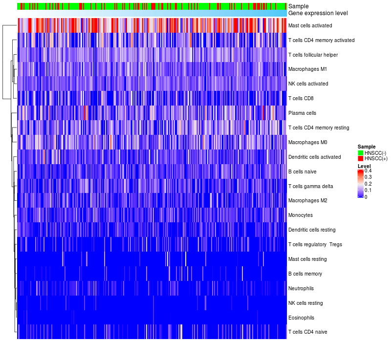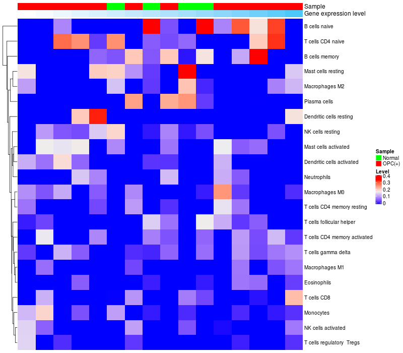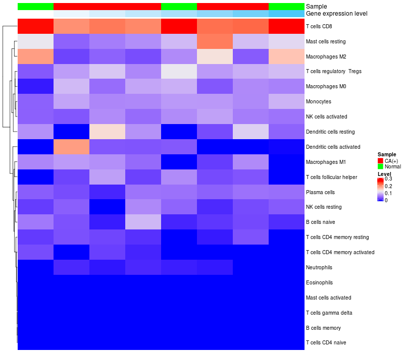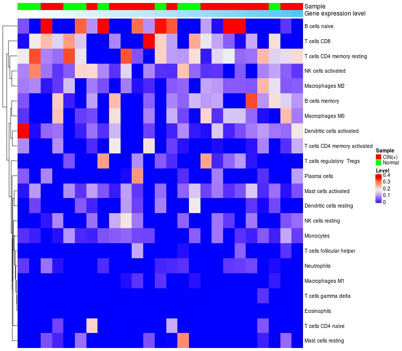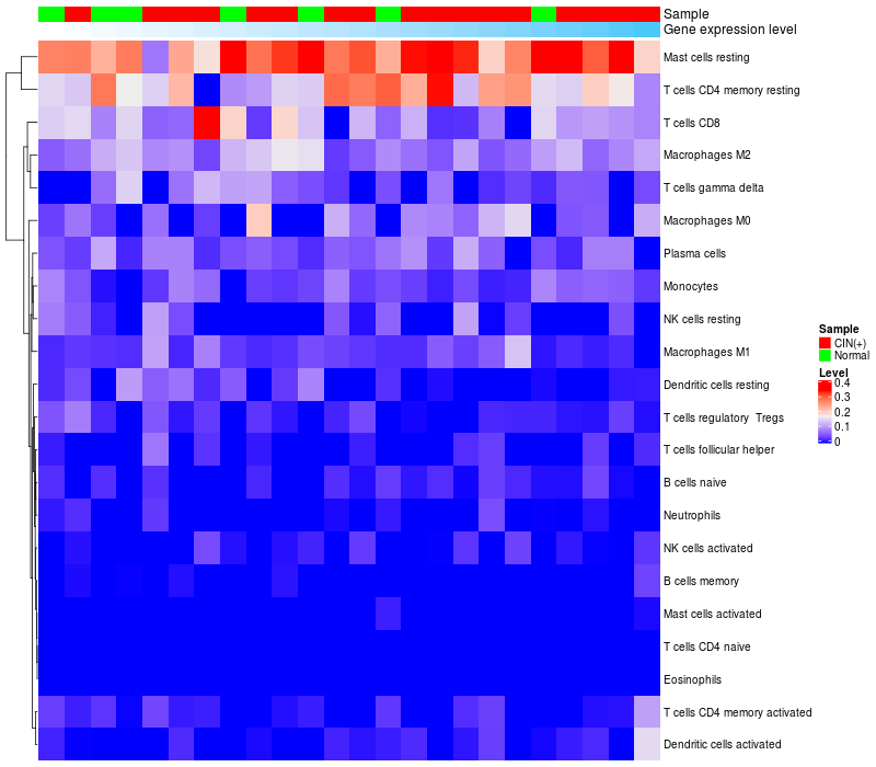 • Left: Heatmap of target gene expression and the level of various types of immune cells (cell type fractions) in all samples based on CIBERSORT method.