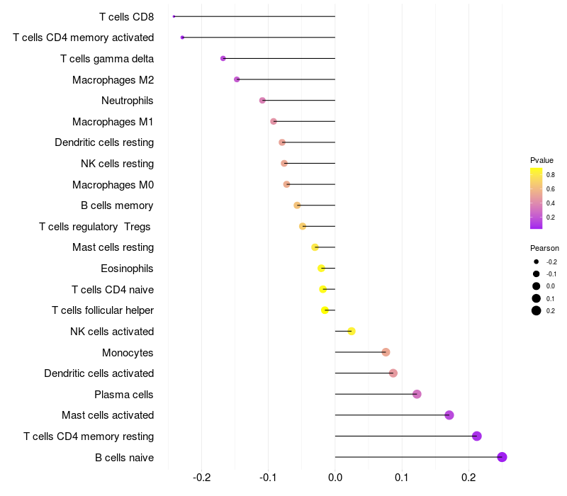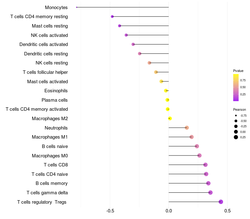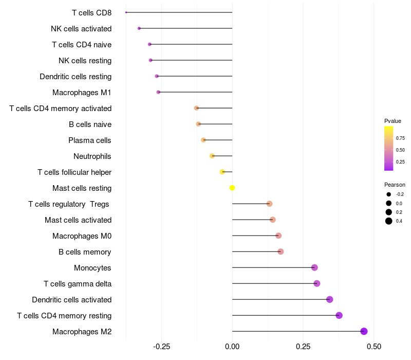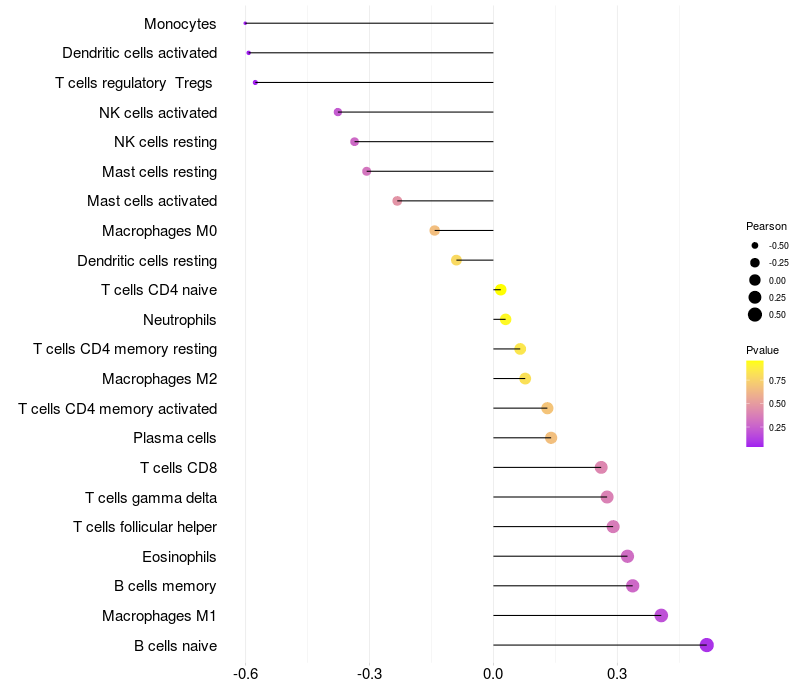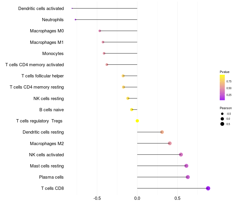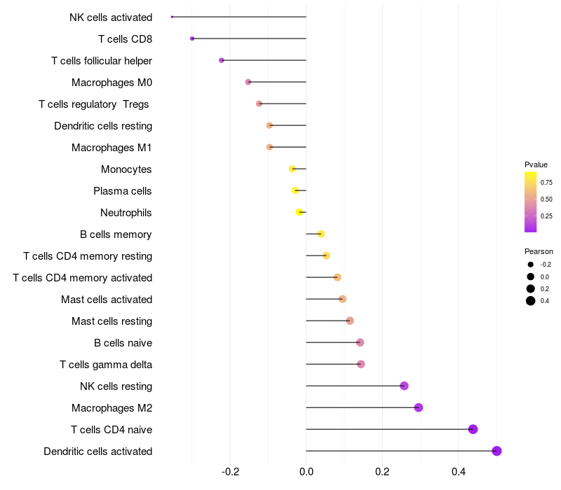 • Right: Correlation of target gene expression and the level of various types of immune cells in virus positive samples (Pearson Correlation Coefficient).