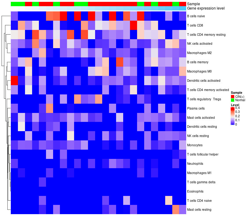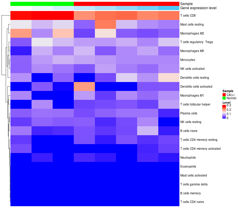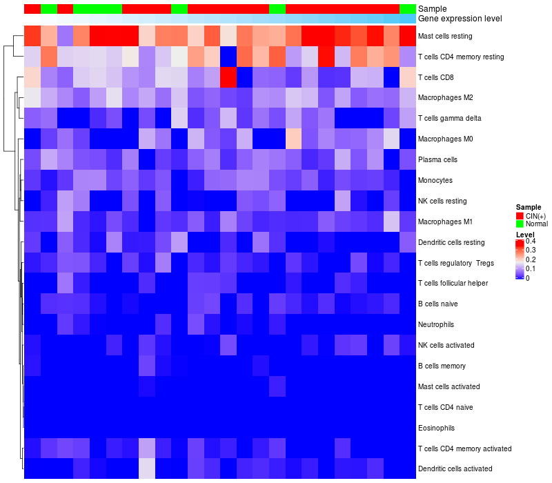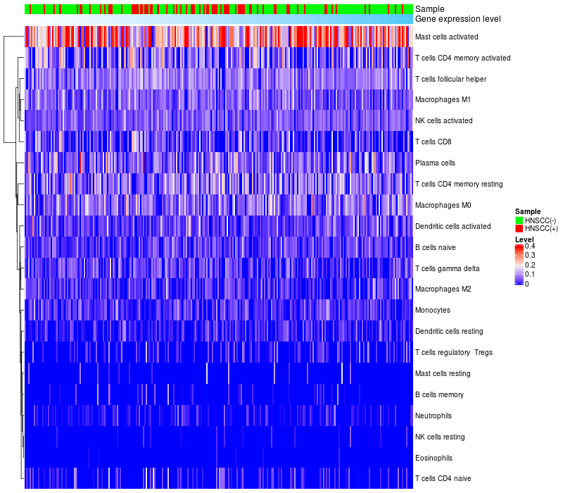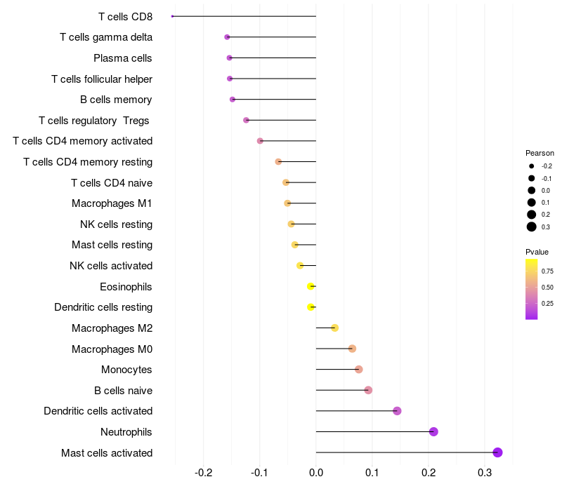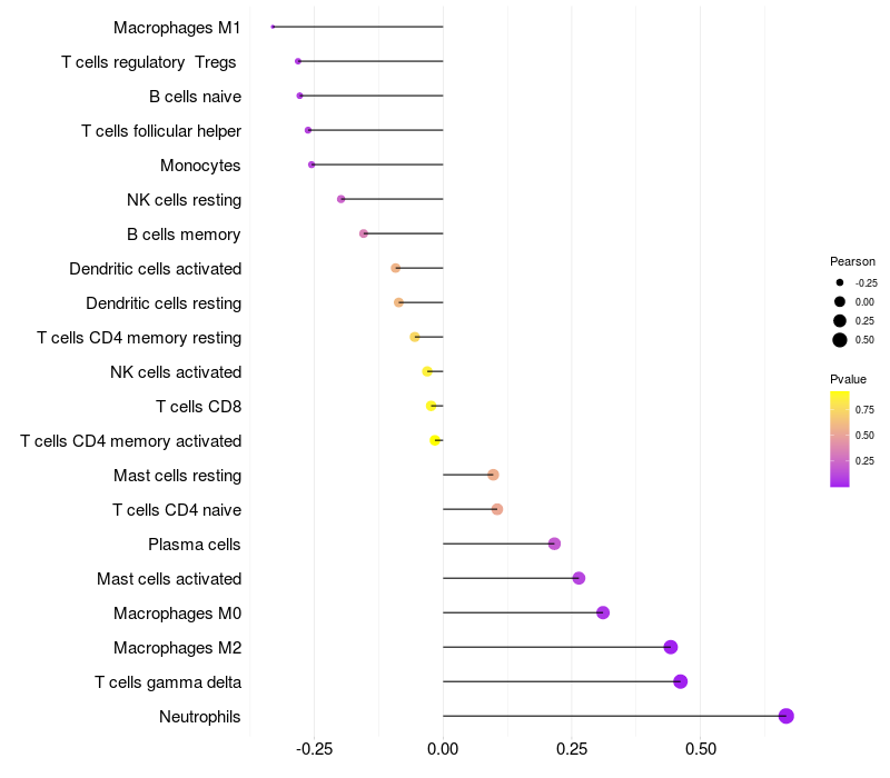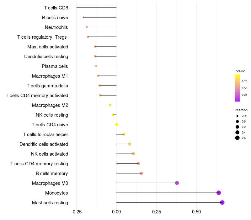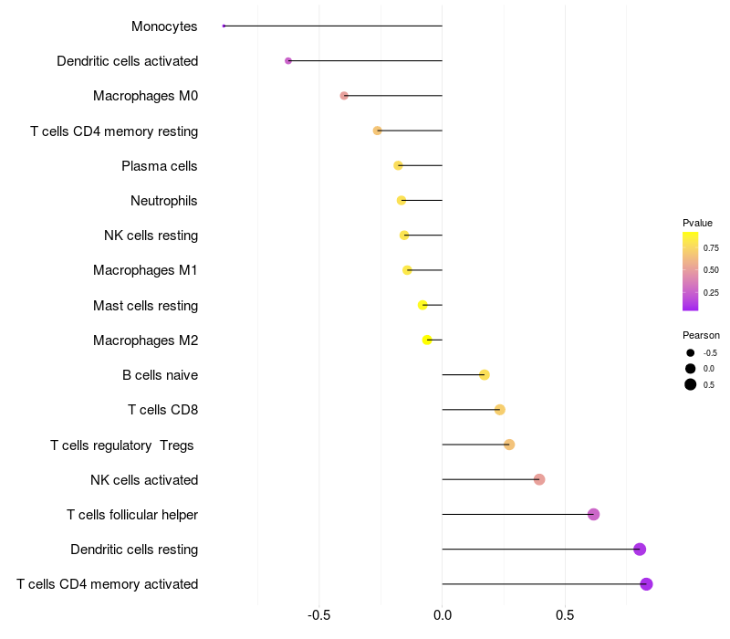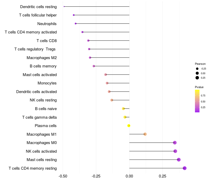 Lollipop of VCX expression and immune infiltrating cell level correlation result in HPV+ samples