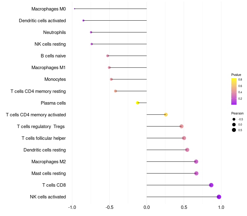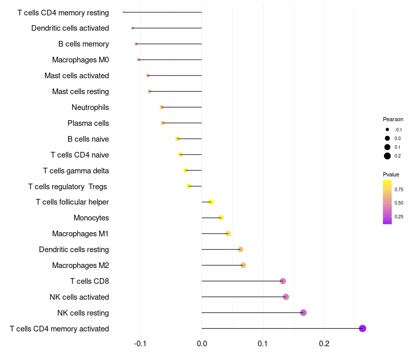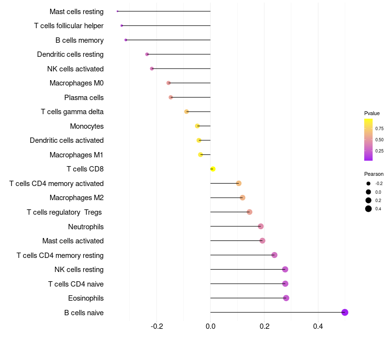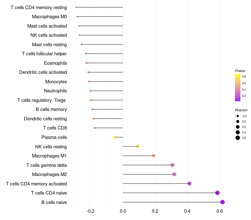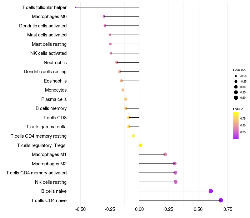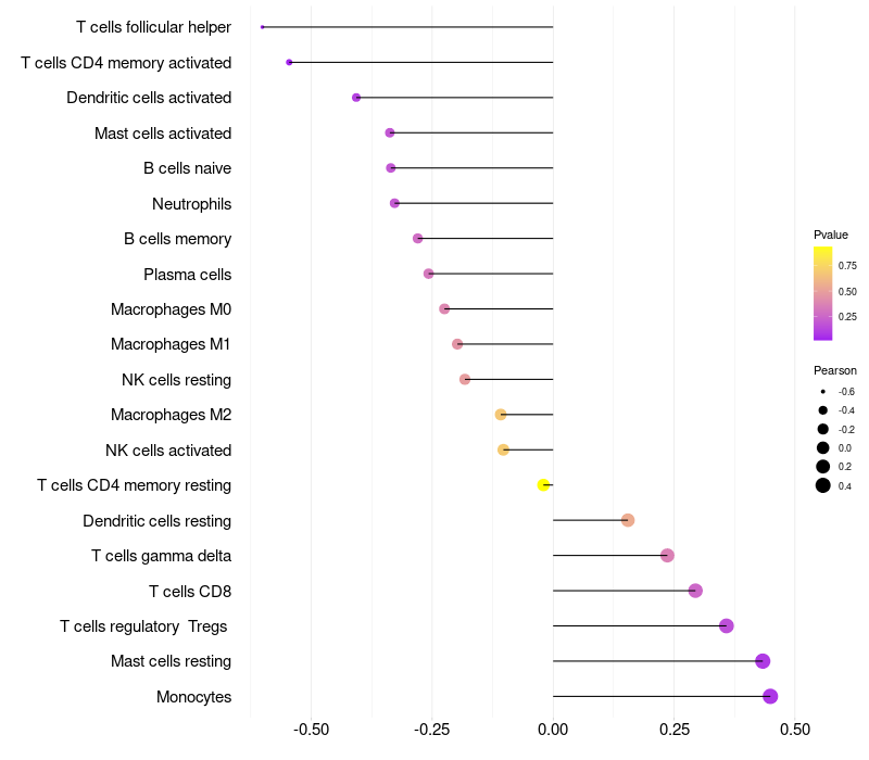 Lollipop of VENTXP1 expression and immune infiltrating cell level correlation result in HPV+ samples