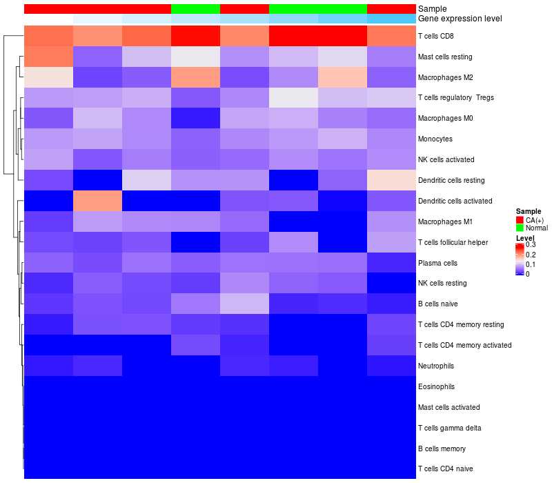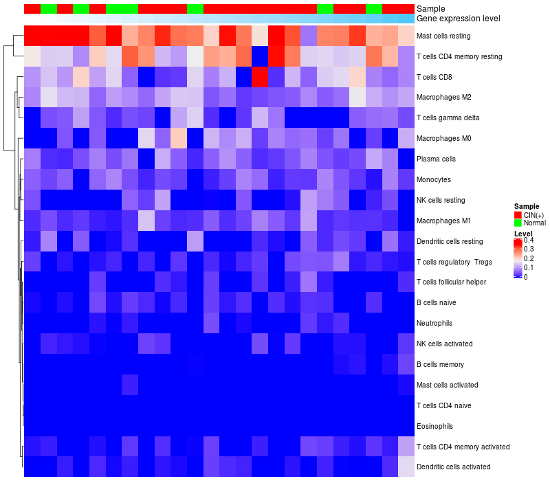 • Left: Heatmap of target gene expression and the level of various types of immune cells (cell type fractions) in all samples based on CIBERSORT method.
