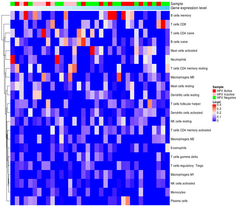HeatMap of cell type fractions in all samples Lollipop of VENTXP7 expression and immune infiltrating cell level correlation result in HPV+ samples