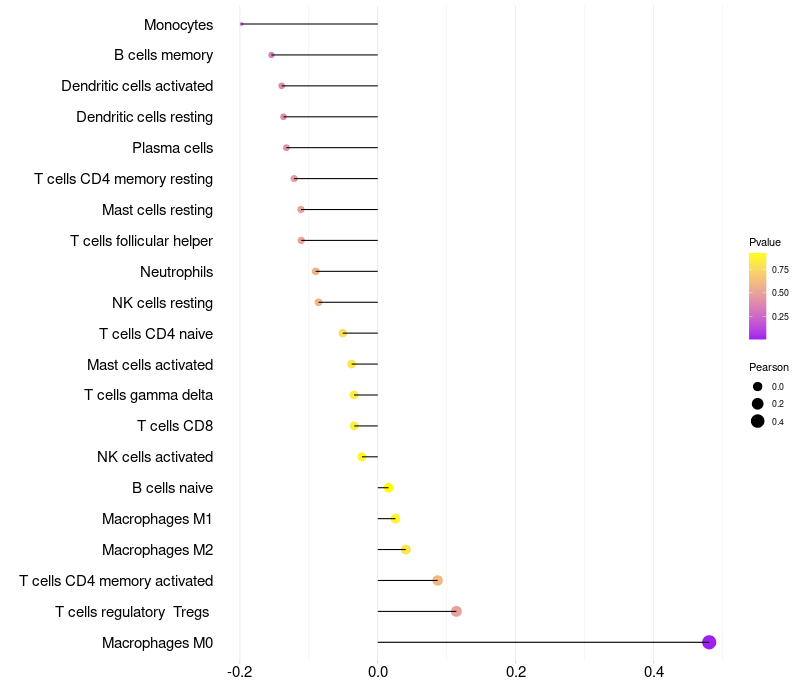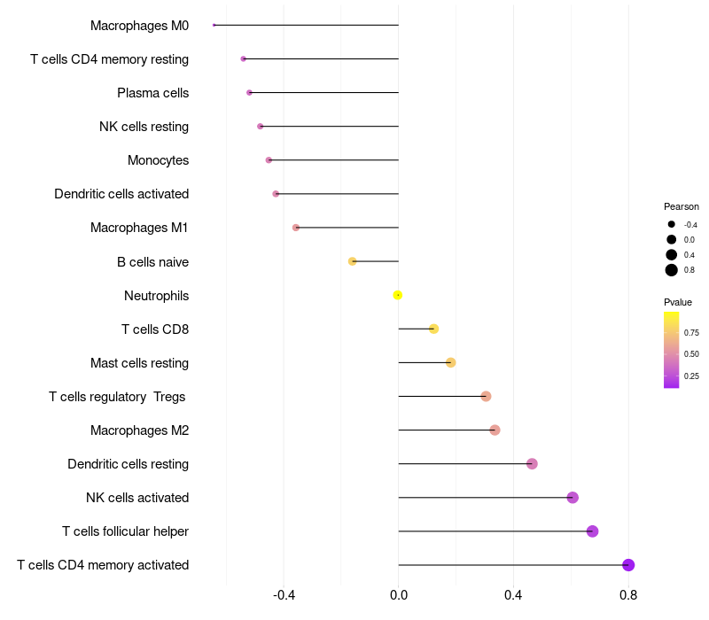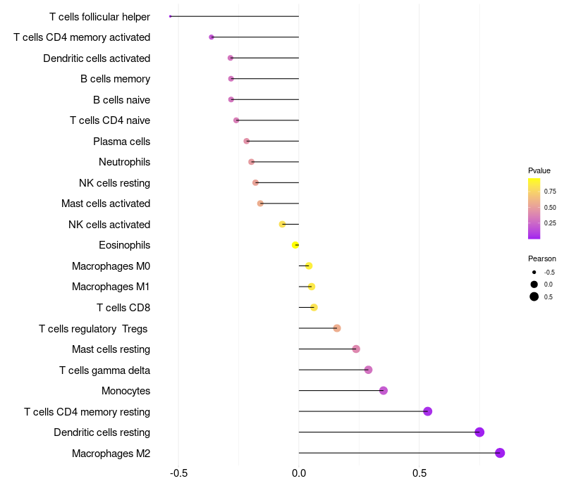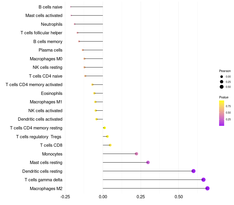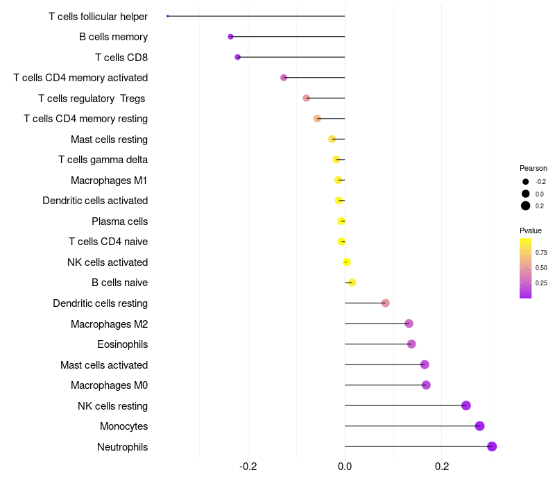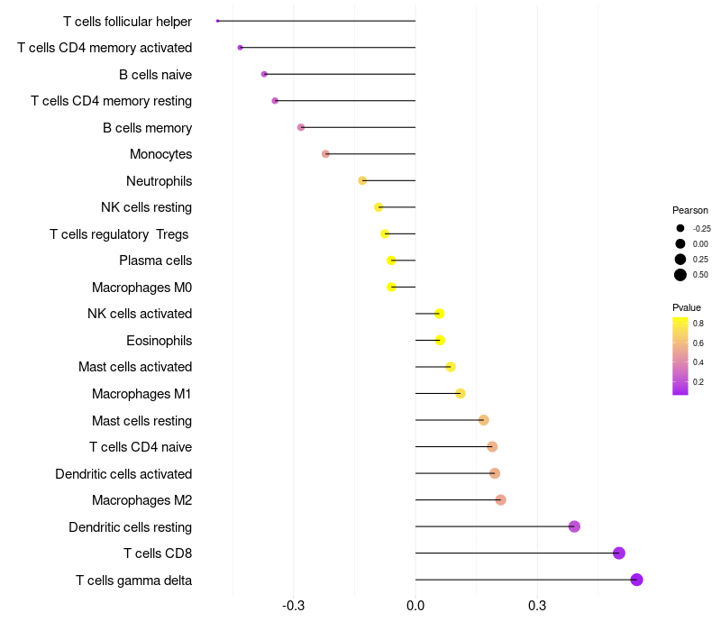 Lollipop of VGLL2 expression and immune infiltrating cell level correlation result in HPV+ samples