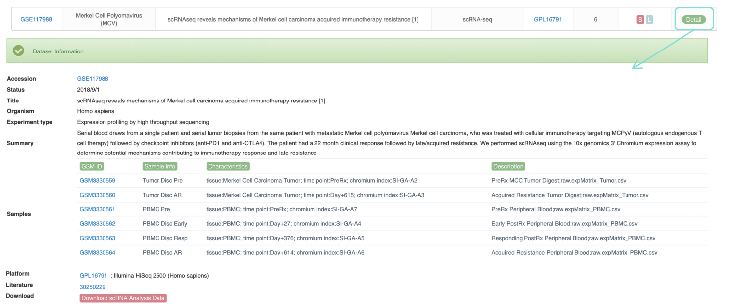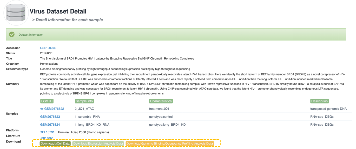 Data Availability column indicates that the data provided by this dataset can be analyzed. In ViMIC 2.0, only basic information of the dataset is displayed for data that cannot be processed or analyzed. We also designed corresponding classification labels: X represents xCell analysis, E represents Differential expression analysis, M represents Differential methylation analysis, C represents Genome binding/occupancy profiling analysis, S represents scRNA analysis, and L represents Literature. Click the Detail button to the detailed information page of the dataset, which provides basic information about the dataset, including the experimental design of each sample. Click the corresponding Download button to download the data results of the corresponding omics analysis.