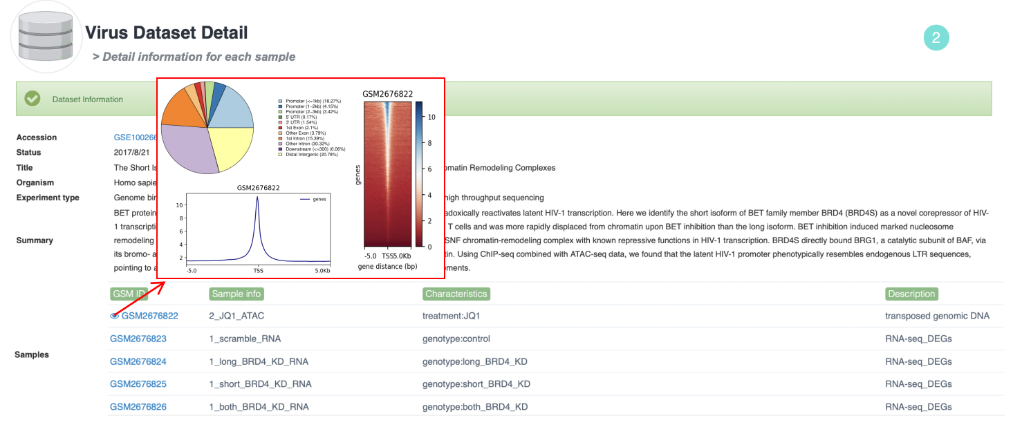 2. For Chip-seq or ATAC-seq data, ViMIC2.0 provides chipseeker annotation pie chart, deeptools analysis heatmap and profile maps for each GSM sample.