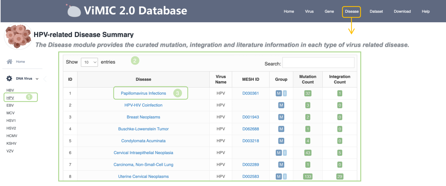 The Disease module provides the curated information in each type of virus-related disease, including mutation and integration. Mutation Count means the total PMID number of virus mutation in virus associated diseases. Integration Count means the total PMID number of virus integration in virus associated diseases.