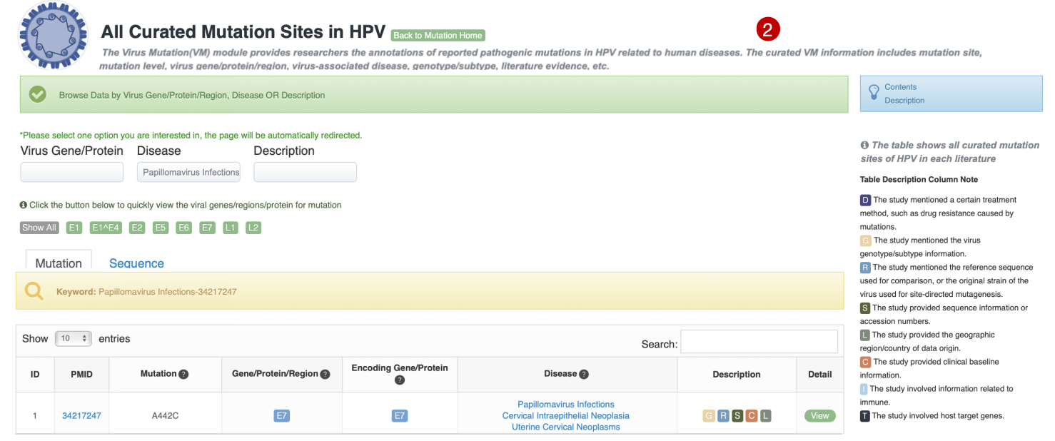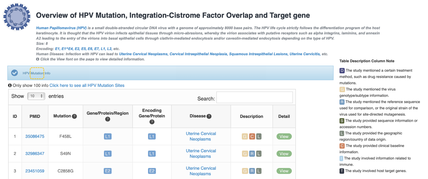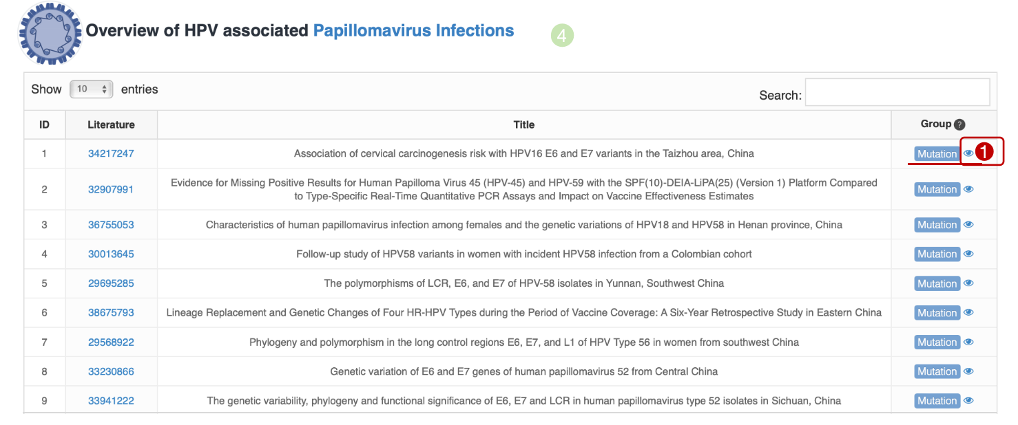 • Mutation Tag: literature about this virus mutation and click the eye icon to see detail mutation information in literature.