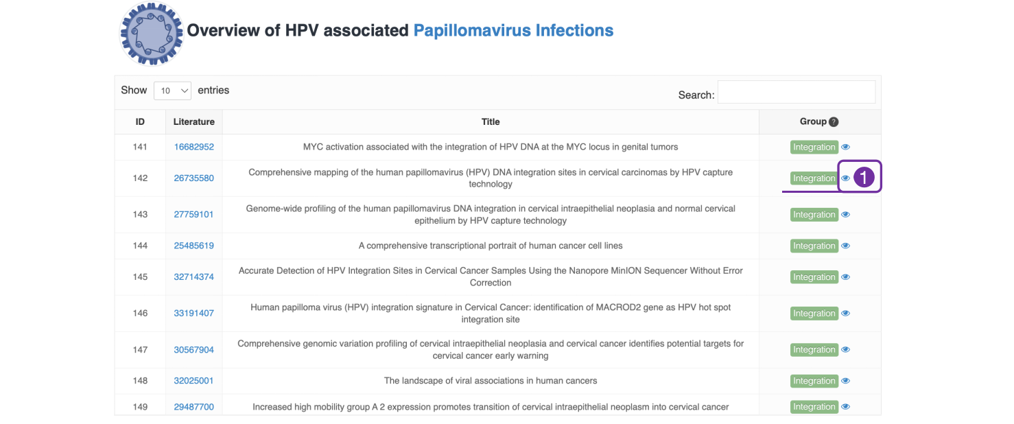 • Integration Tag: literature associated this virus integration and click the eye icon to see detail information of 3 cistrome factors (histone modification, transcription factor binding site and chromatin accessibility).