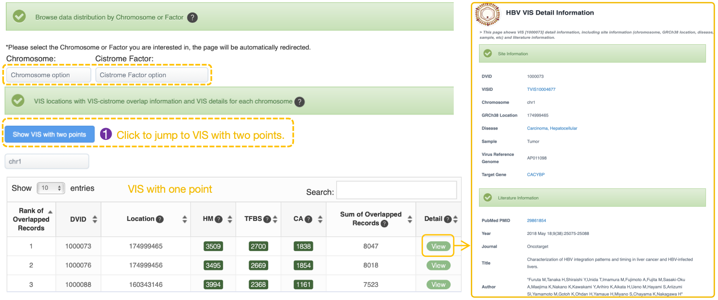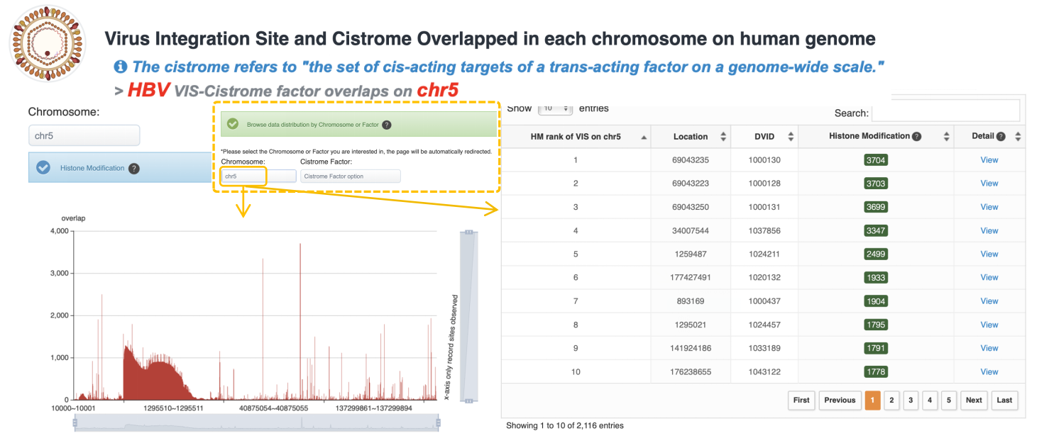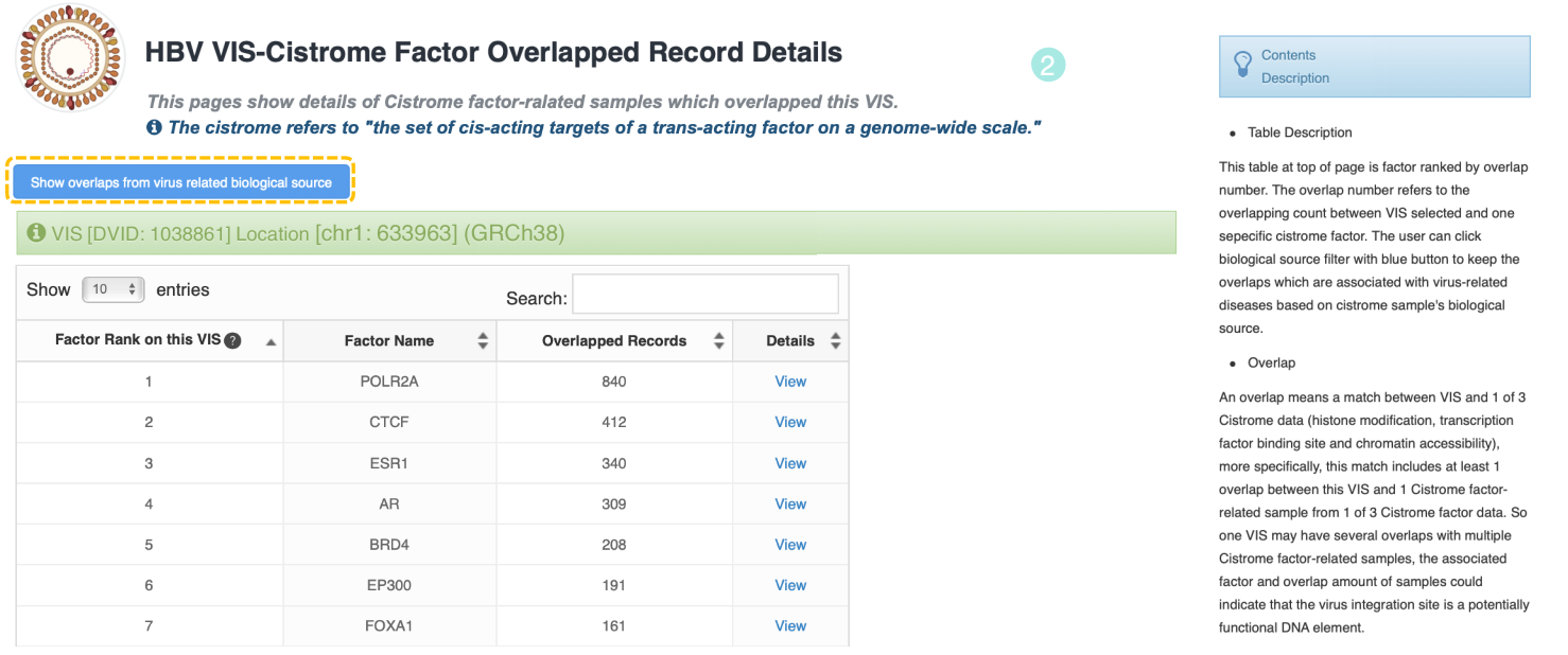 An ‘Overlapped Records’ means a match between VIS and 1 of 3 Cistrome factor (histone modification, transcription factor binding site and chromatin accessibility), more specifically, this match includes at least 1 overlap between this VIS and 1 Cistrome factor-related sample from 1 of 3 Cistrome factor data. So, one VIS may have several overlaps with multiple Cistrome factor-related samples, the associated factor and overlap number of samples could indicate that the virus integration site is a potentially functional DNA element. The interface details are as follows: