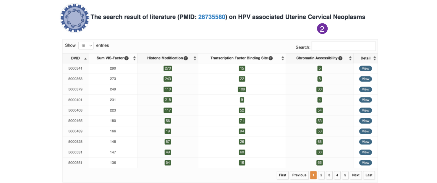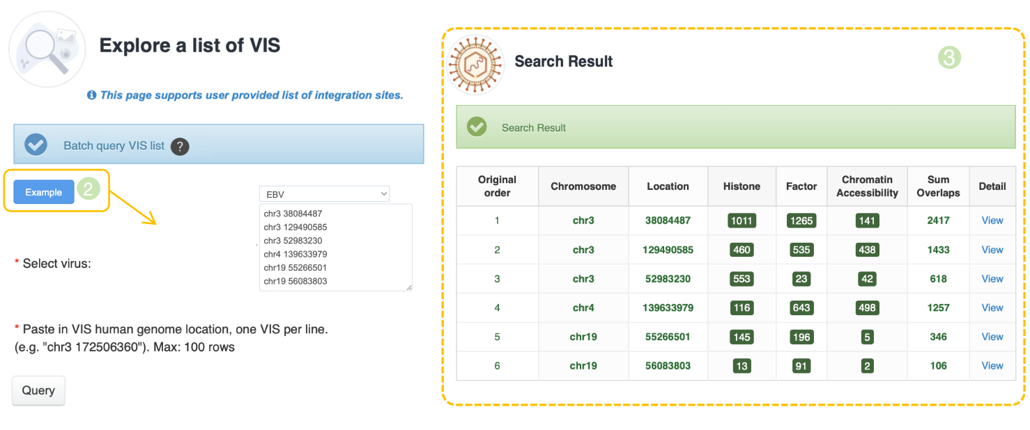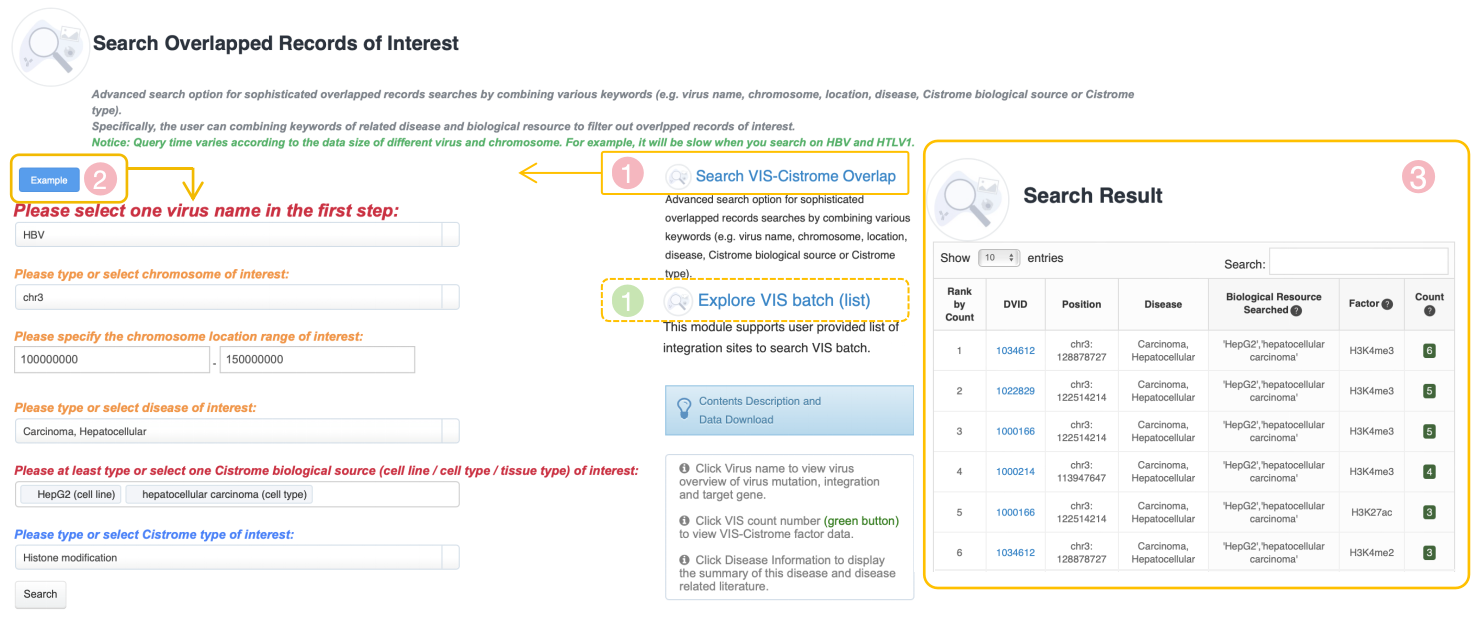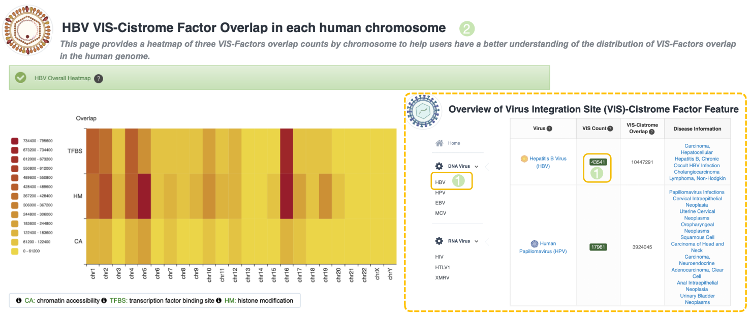 An ‘Overlapped Records’ means a match between VIS and 1 of 3 Cistrome factor (histone modification, transcription factor binding site and chromatin accessibility), more specifically, this match includes at least 1 overlap between this VIS and 1 Cistrome factor-related sample from 1 of 3 Cistrome factor data. So, one VIS may have several overlaps with multiple Cistrome factor-related samples, the associated factor and overlap number of samples could indicate that the virus integration site is a potentially functional DNA element. The interface details are as follows: