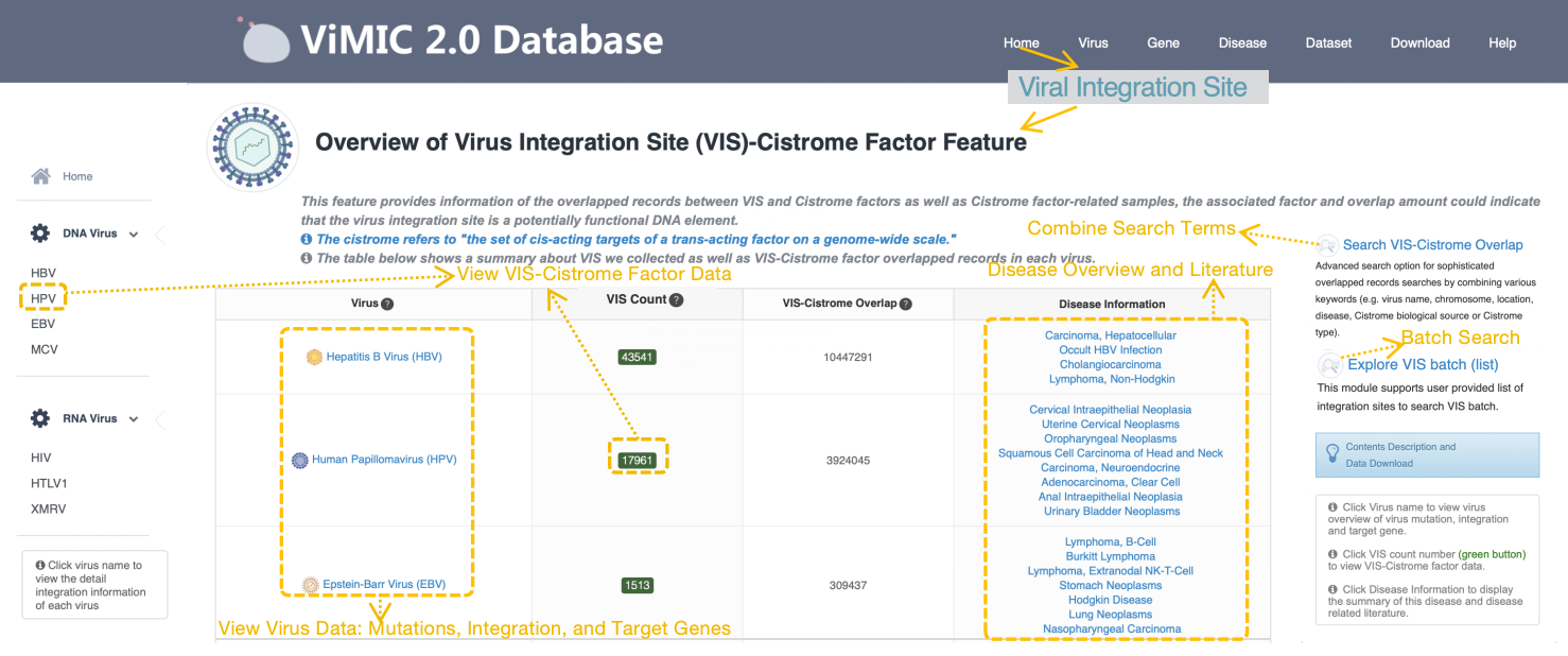 This feature provides information of the overlapped records between VIS and Cistrome factors as well as Cistrome factor-related samples, the associated factor and overlap amount could indicate that the virus integration site is a potentially functional DNA element. The cistrome refers to "the set of cis-acting targets of a trans-acting factor on a genome-wide scale." The table below provide virus navigation and VIS-cistrome data statistics which summaries about VIS we collected as well as VIS-Cistrome factor overlapped records in each virus. Click virus name to view virus overview of virus mutation, integration and target gene. Click VIS count number (green button) to view VIS-Cistrome factor data. Click Disease Information to display the summary of this disease and disease related literature. The user can click “Search VIS-Cistrome Overlap” to access advanced search options for finding overlapping records by combining various keywords or choose "Explore VIS batch (list)" to search VIS batch.