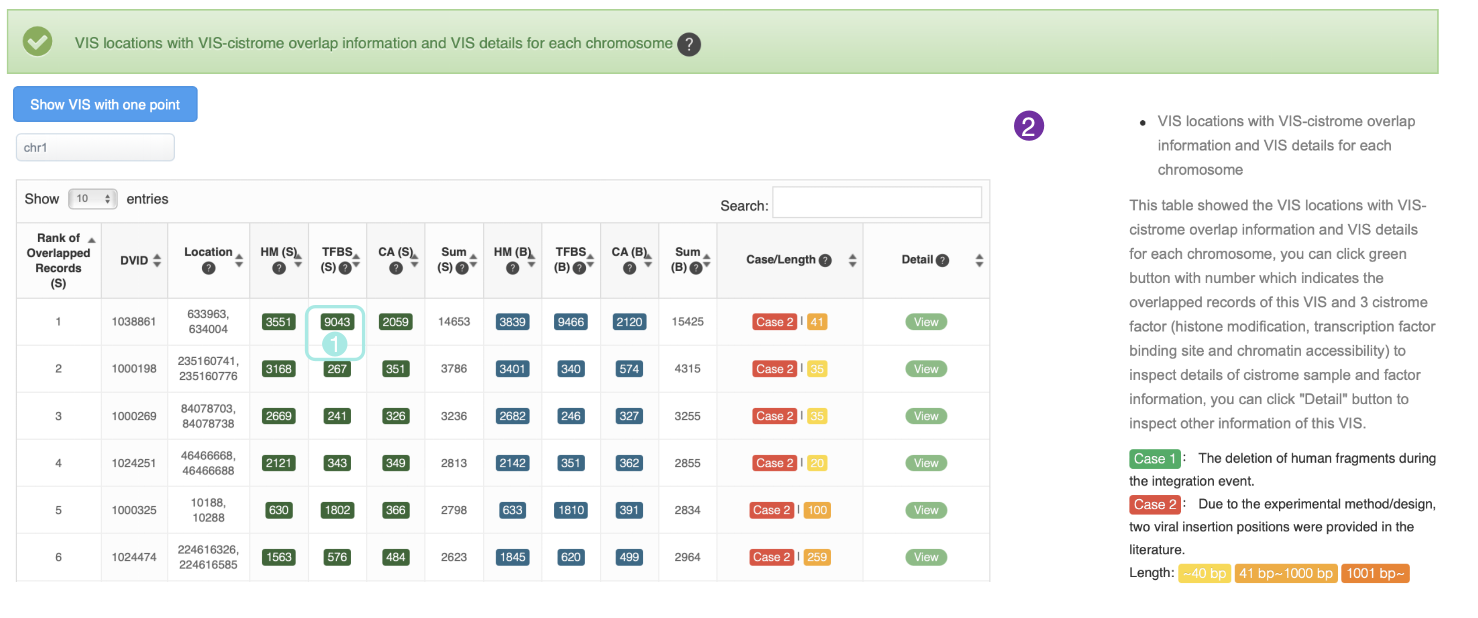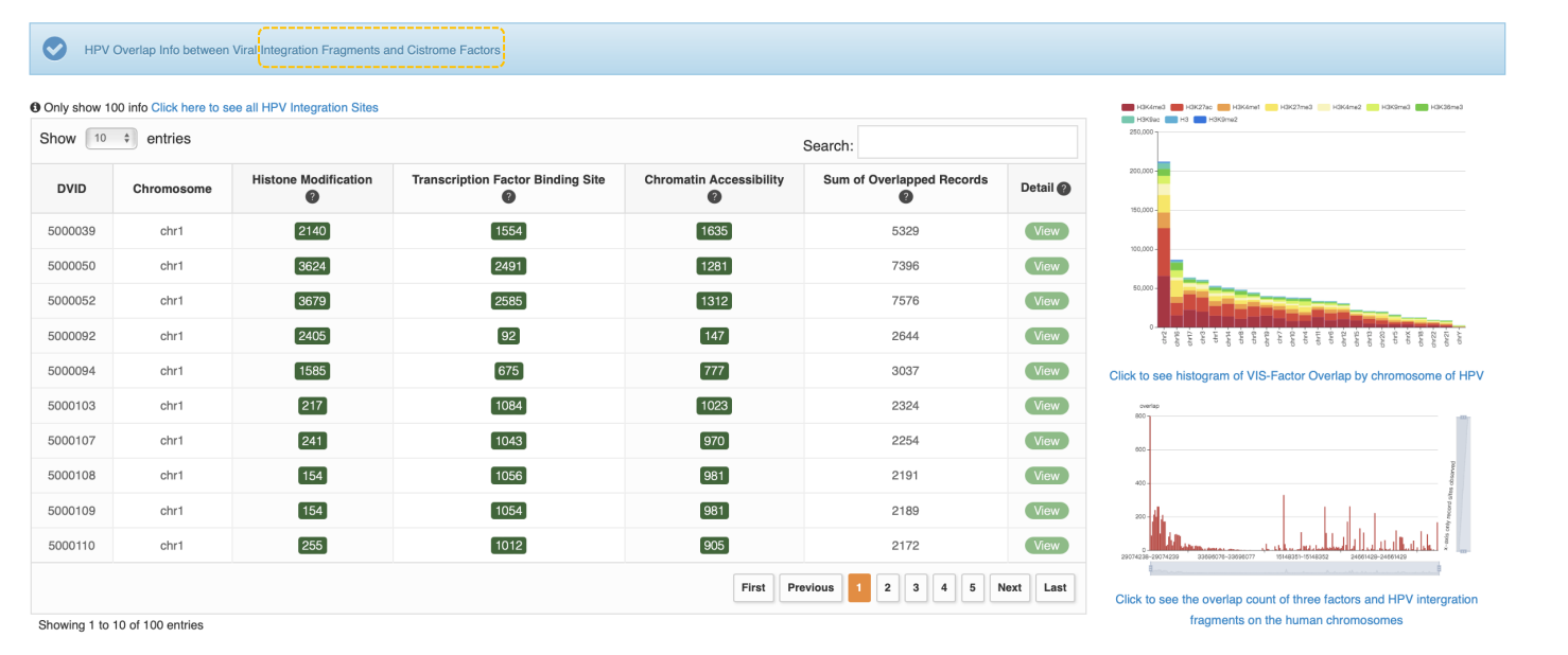 The histogram shows the overlap count of three factors (histone modification, transcription factor binding site, and chromatin accessibility) and virus integration fragments on the human chromosomes. The y-axis represents the number of overlaps, and the X-axis represents the integrated fragments. The table shows the Cistrome factor count rank of VIS on the chromosome user selected. The user can click green button to view details and view VIS detail information by clicking "View" button at Detail column.
