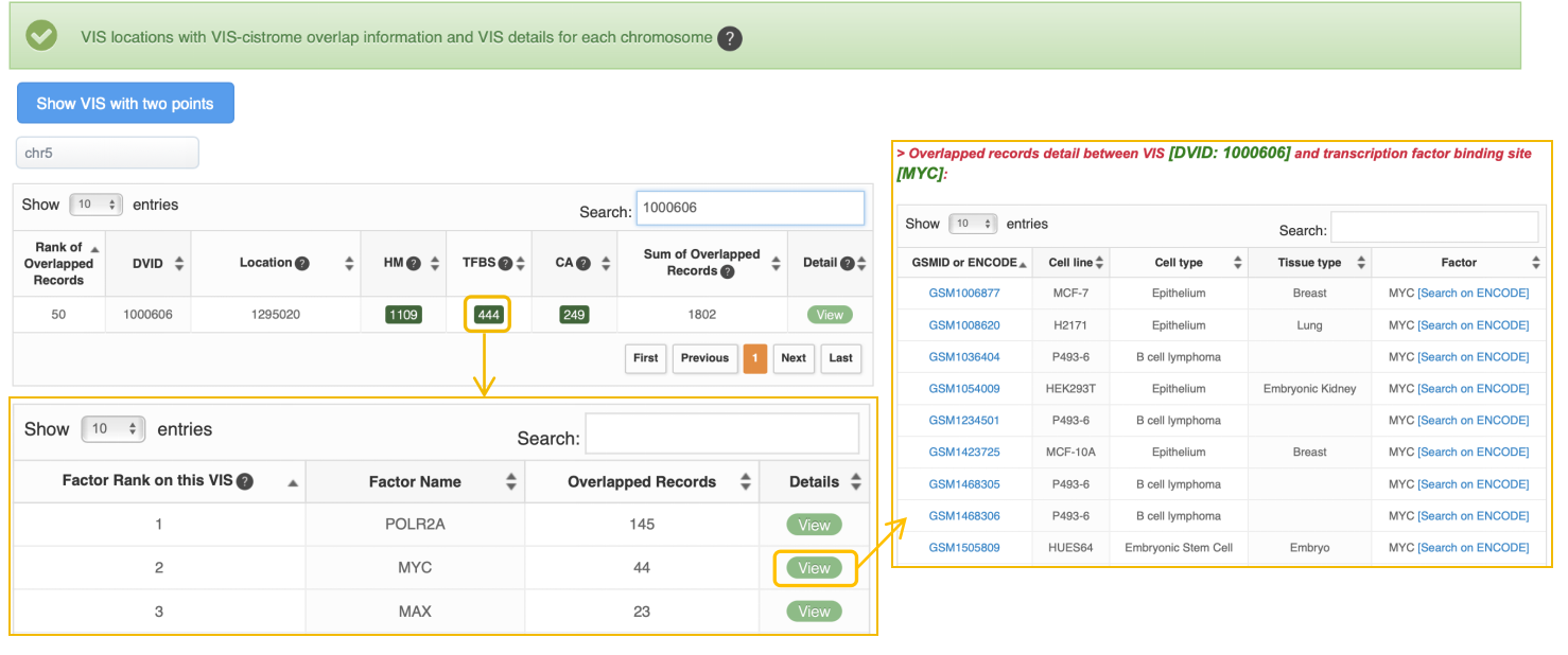 This table shows VIS locations with VIS-Cistrome overlap information for each chromosome. When selecting the chromosome of interest, users can browse VIS information which indicates the numbers of VIS and three Cistrome factors’ overlapped records. Click ‘View’ button to show the detailed information of selected VIS.