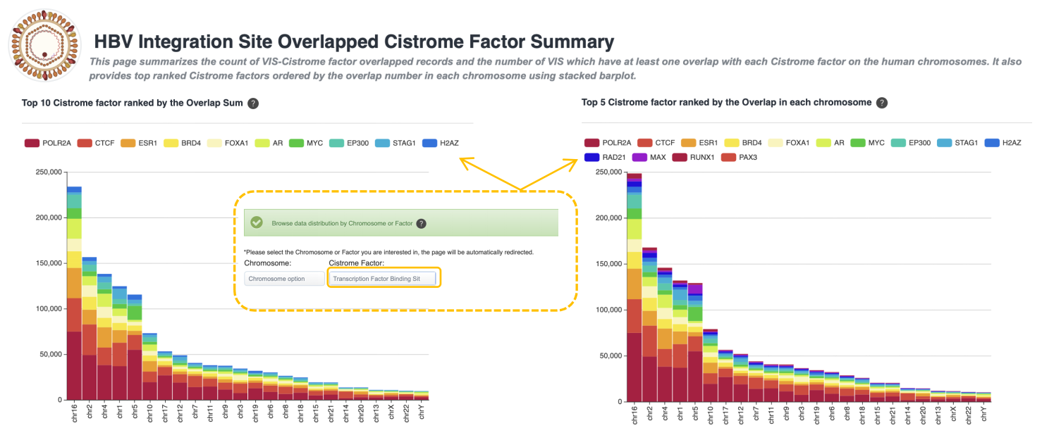 The user can browse HBV VIS-Cistrome factor overlapped records data by specific chromosome or statistics histogram for specific Cistrome factor when click the chromosome or Cistrome factor the user is interested in.