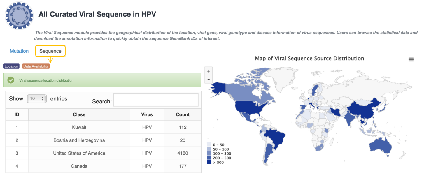 The Viral Sequence module provides the geographical distribution of the source, viral gene, region and genotype of virus sequences. Users can browse the statistical data o for geographical distribution and download the annotation information to quickly obtain the sequence GeneBank IDs of interest.