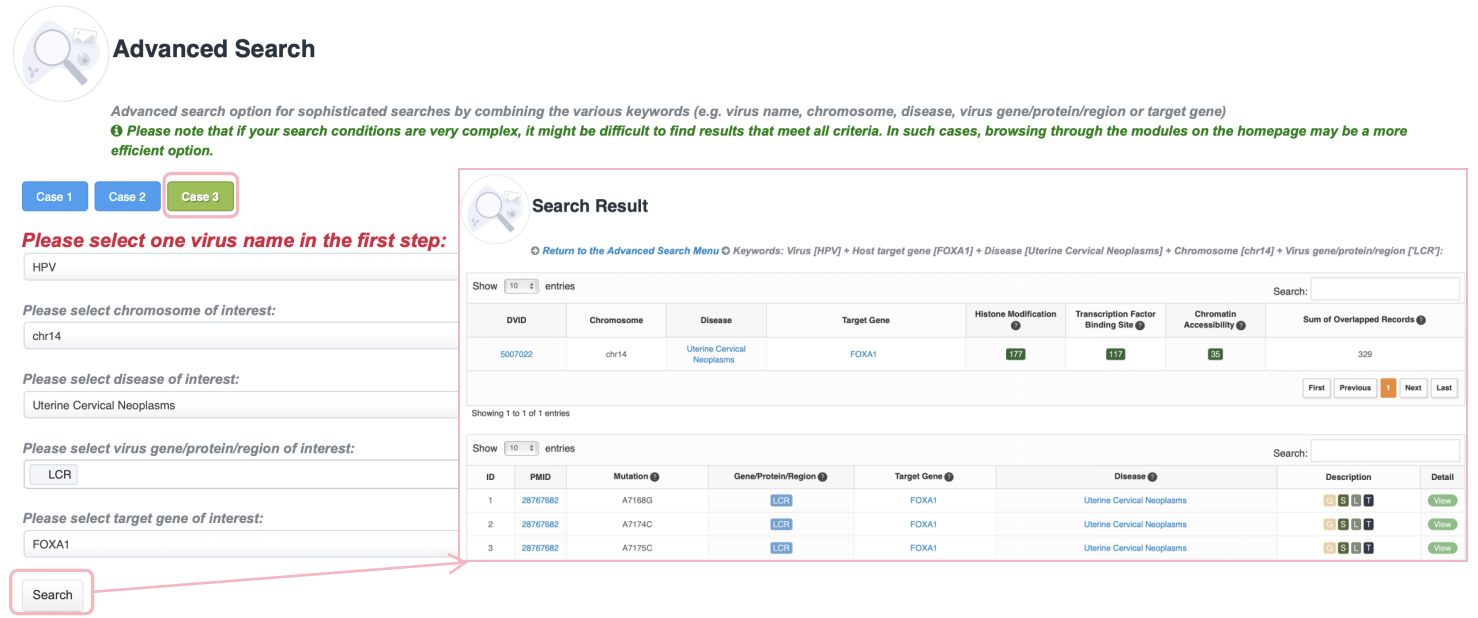 Advanced search option for sophisticated overlapped records searches by combining various keywords (e.g. virus name, chromosome, location, disease, Cistrome biological source or Cistrome type). Specifically, the user can combine keywords of related disease and biological resource to filter out overlapped records of interest.