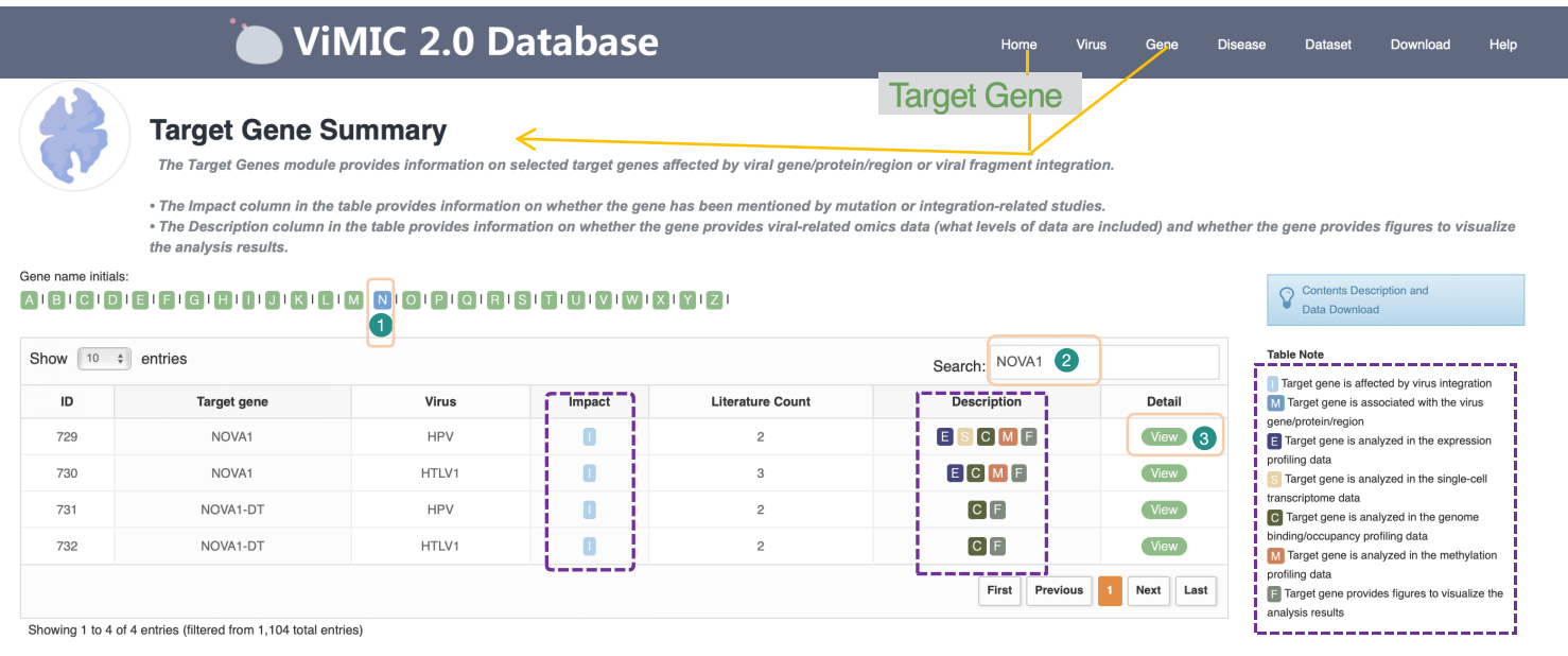 Using the NOVA1 gene from HPV research as an example, we've segmented the data by initial letter to speed up access. Click the letter "N" to search for NOVA1 in the upper right corner of the table. Click the "View" button for the corresponding virus to view detailed information.