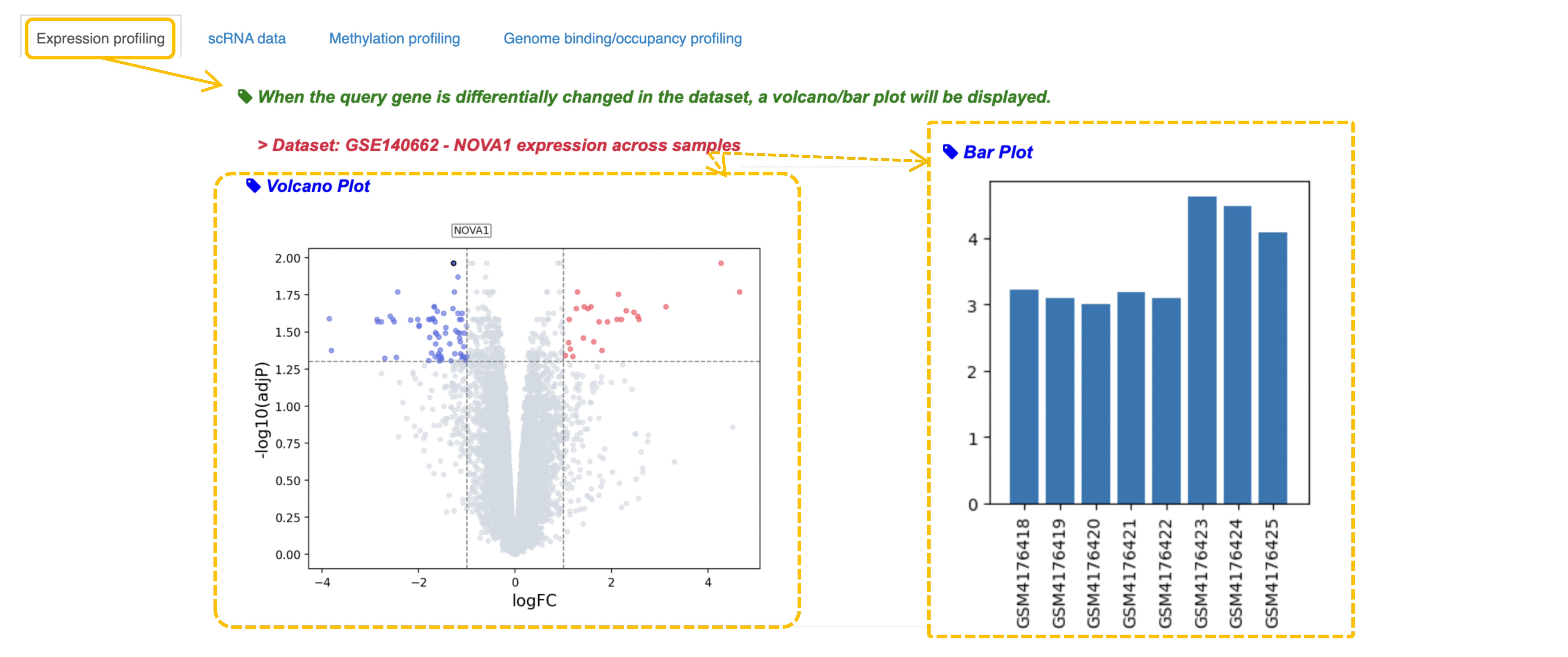 1. If the gene is a differentially expressed gene, a volcano plot and a bar plot are displayed below.