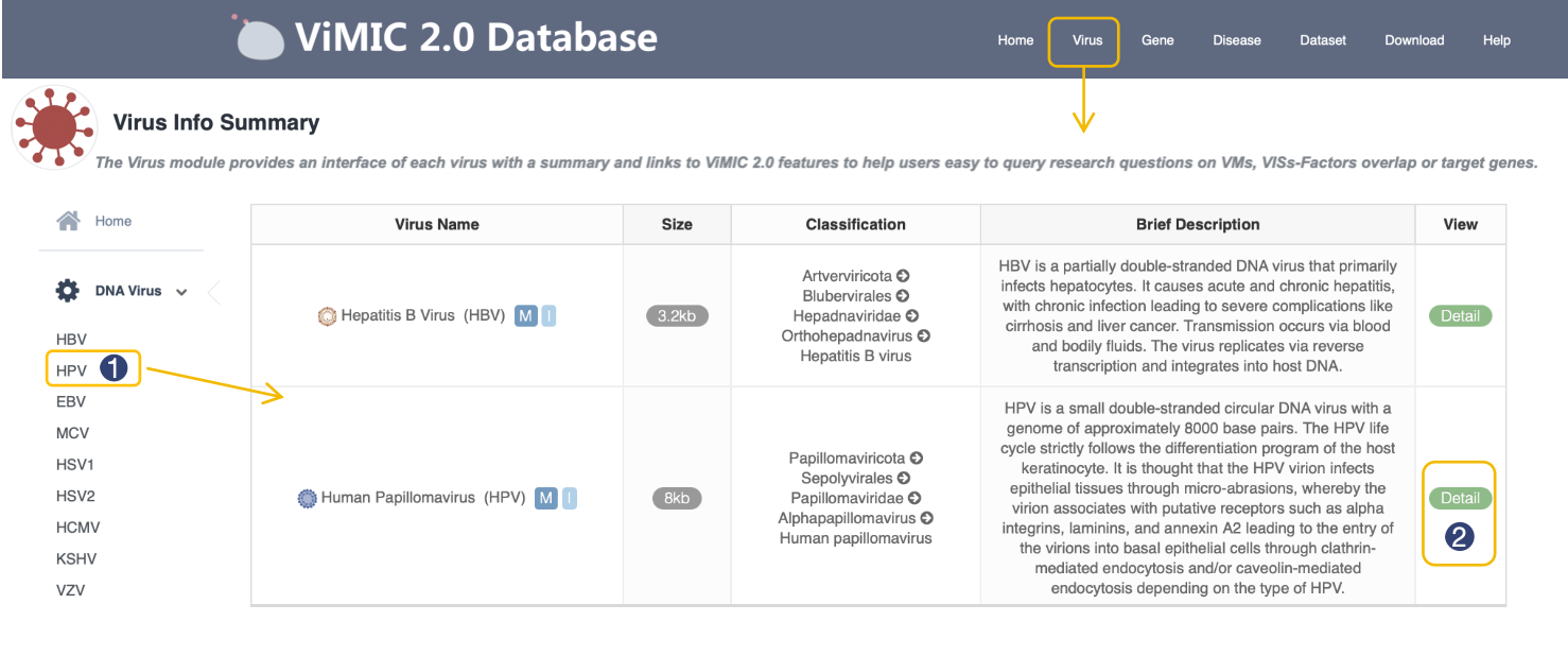 The Virus module provides an interface of each virus with a summary and links to ViMIC2.0 features to help users easy to query research questions on VMs, VISs-Factors overlap (only for integrated viruses) or target genes, the table below shows basic information of 28 viruses in ViMIC2.0, including Virus Name, Size, Classification and Brief Description, click the View button in table to see the overview of three modules.